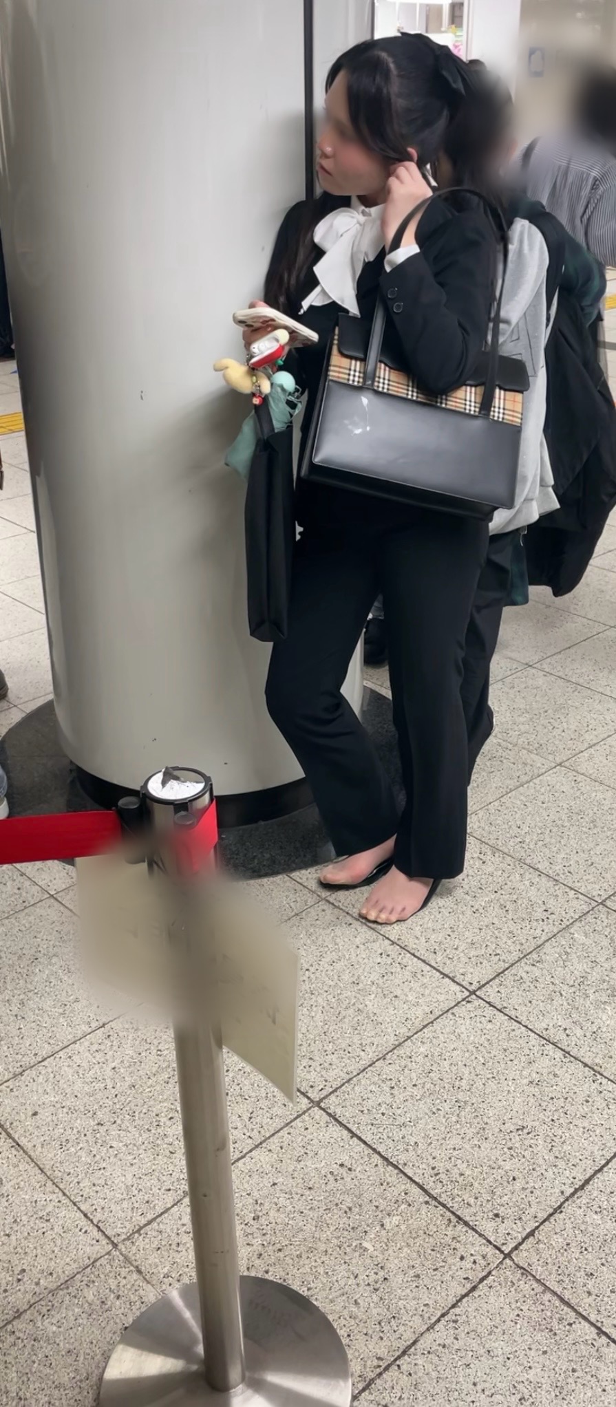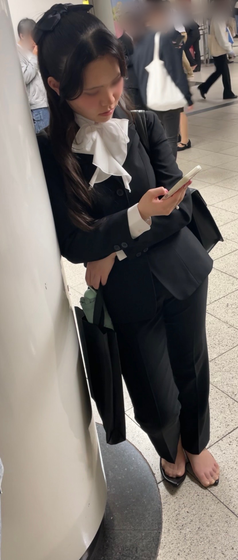 けいぽんさん、素晴らしいです!4月初めのリクスー姿のお嬢さんにはあるあるの姿ですね。でも、靴脱いでそのまま地面に立つなんて男子では考えられないんですが、パンプス脱いでスト足で立っている姿、たまらないですね。スカート姿なのも良いです。
