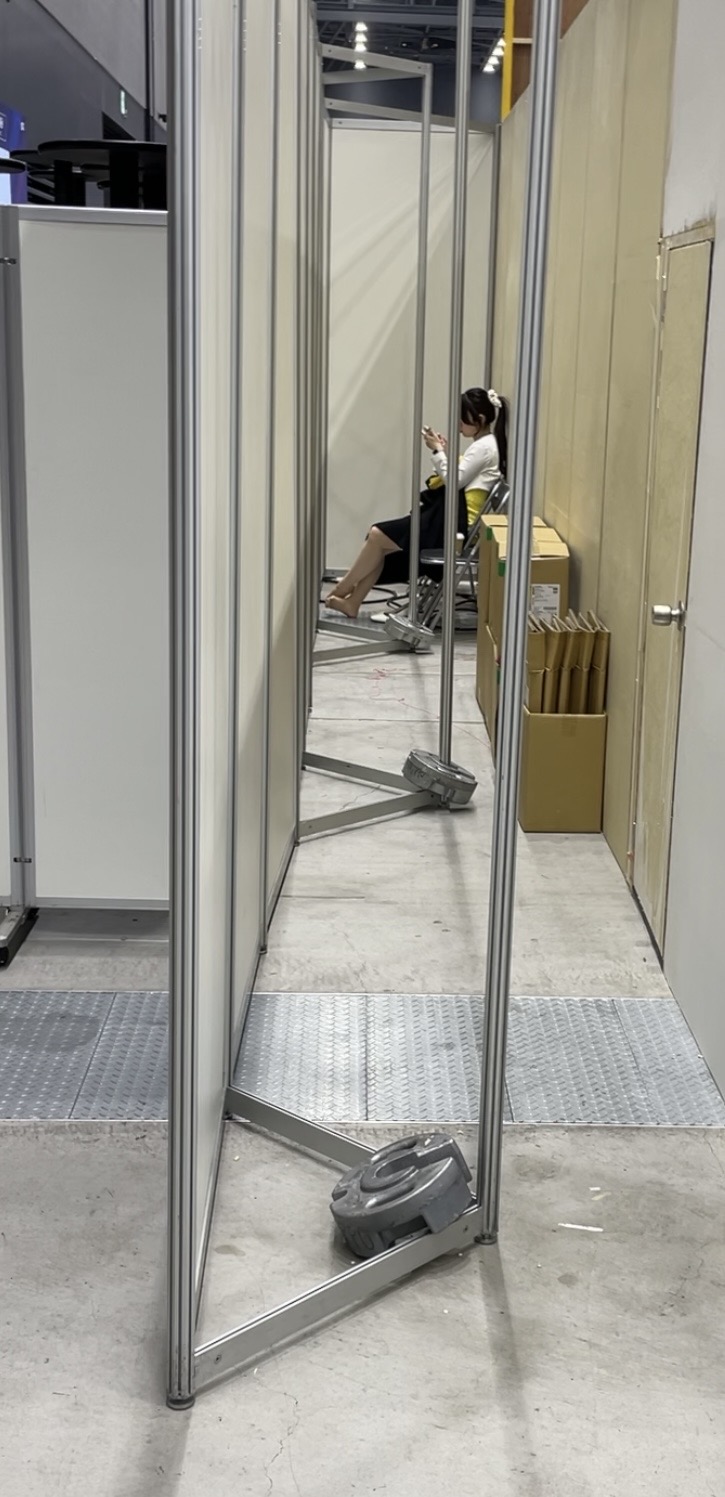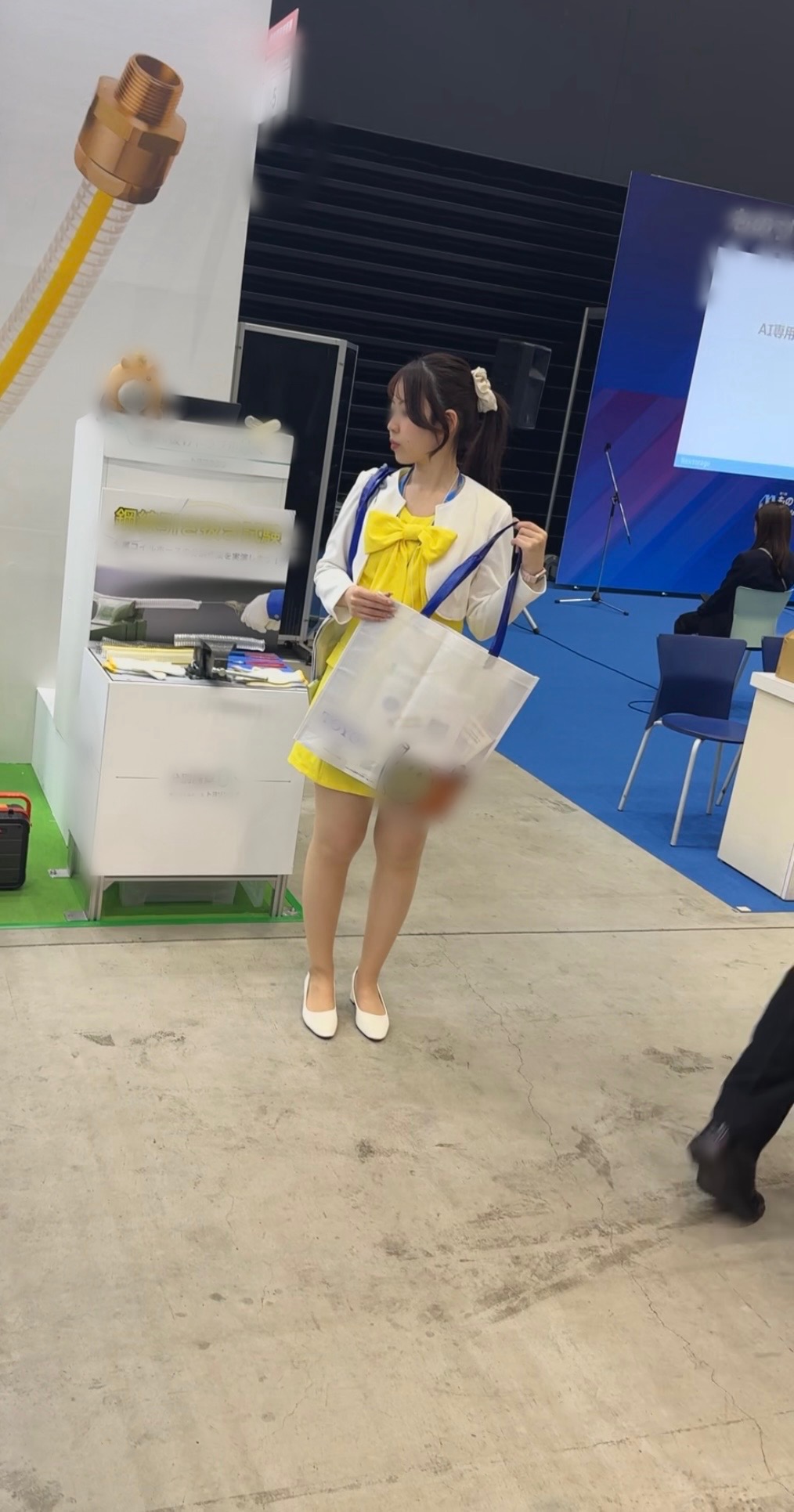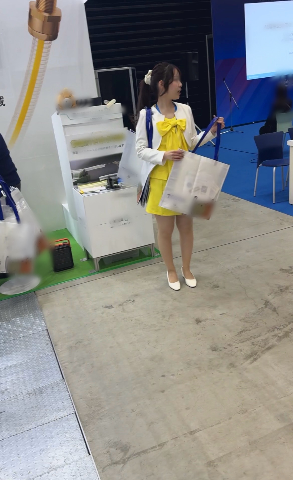 遠いアングルですみません。イベントコンパニオンさんがバックヤードの奥でパンプス全脱ぎしてスト足を解放しておりました。近くにはいけなかったため、遠くからのアングルになりますが、いかがでしょうか?
