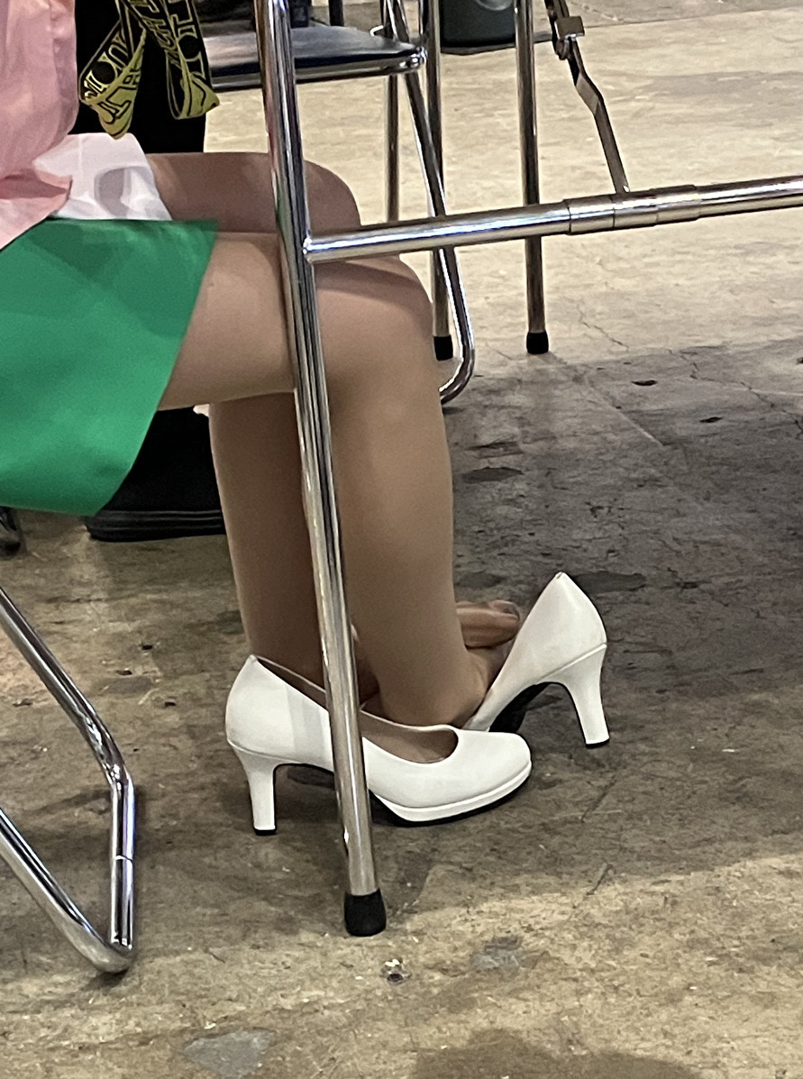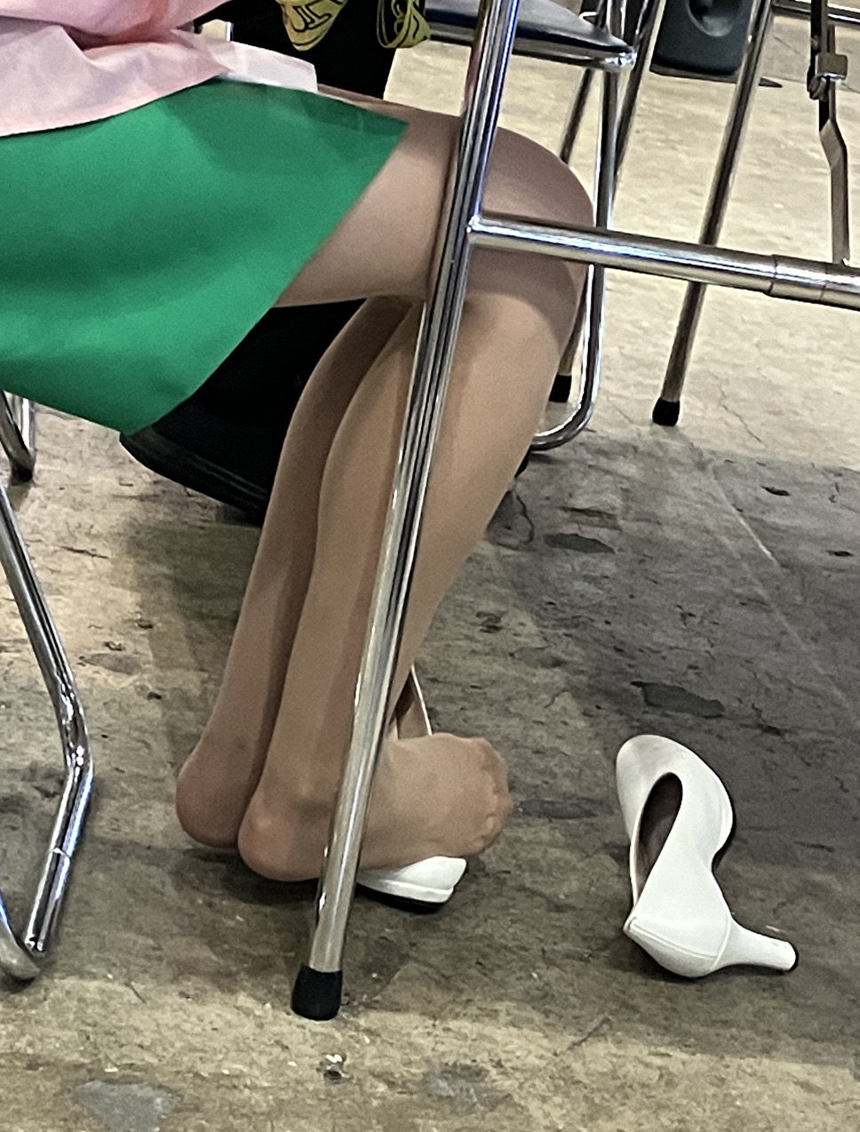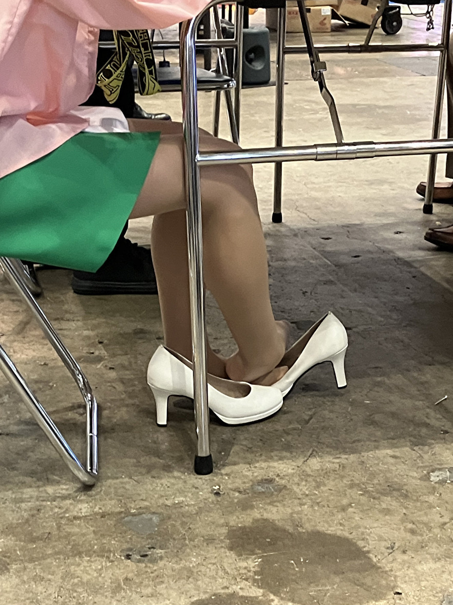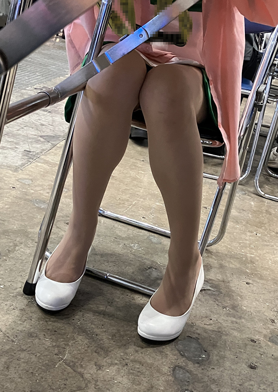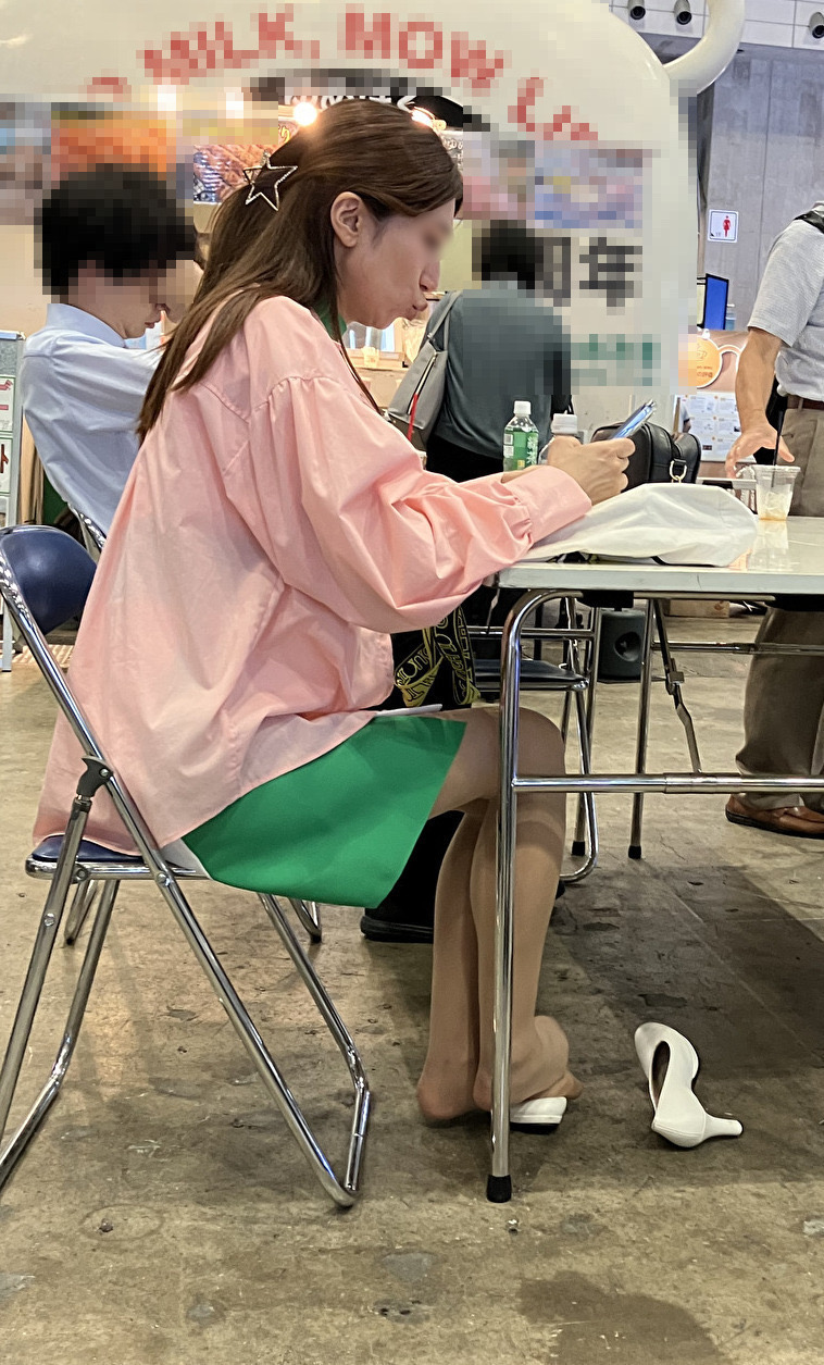 さて、片足パンプス脱ぎだった美脚コンパニオンさんの続きです。両足とも白パンプスを脱いでいるのですが、スト足をどうしているのかはじっくり観察してみてください。