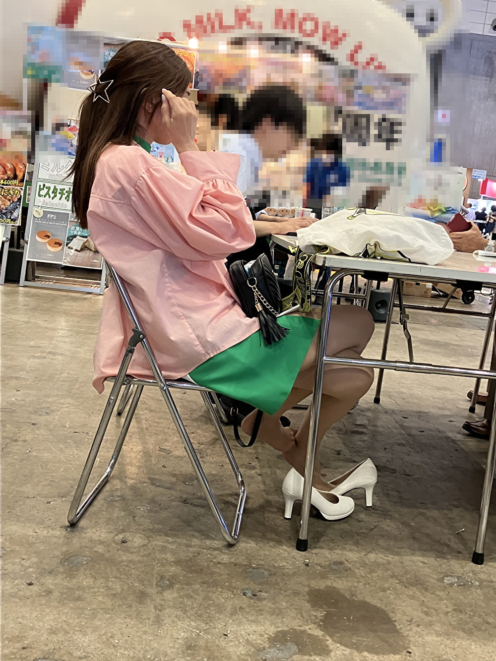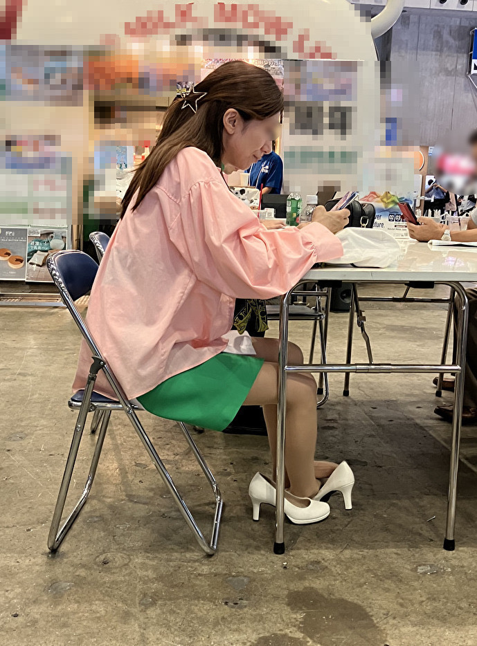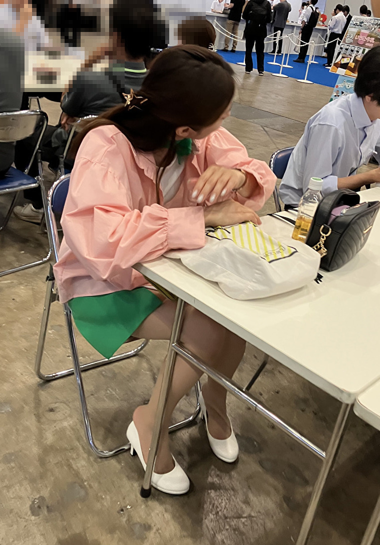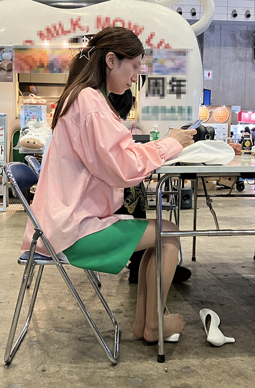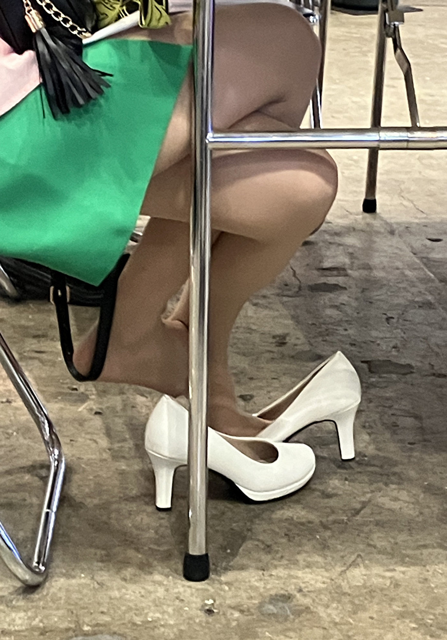 さて、片足パンプス脱ぎだった美脚コンパニオンさんの続きです。両足とも白パンプスを脱いでいるのですが、スト足をどうしているのかはじっくり観察してみてください。