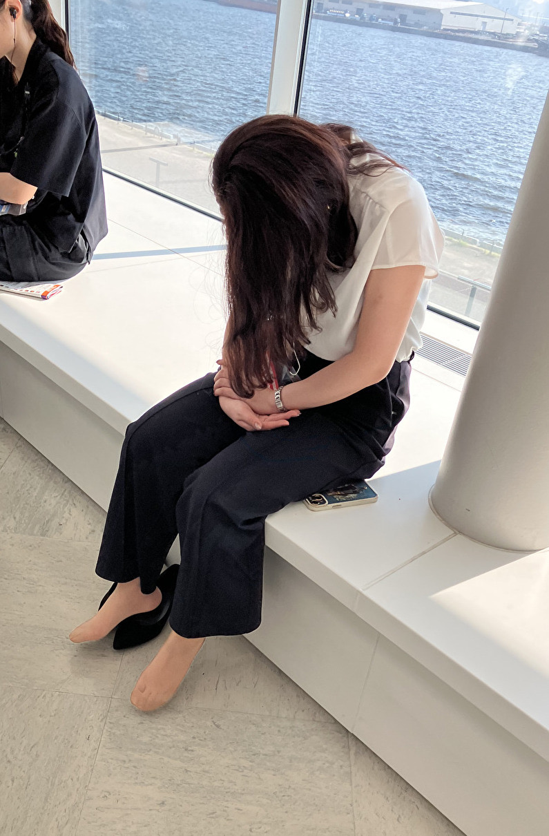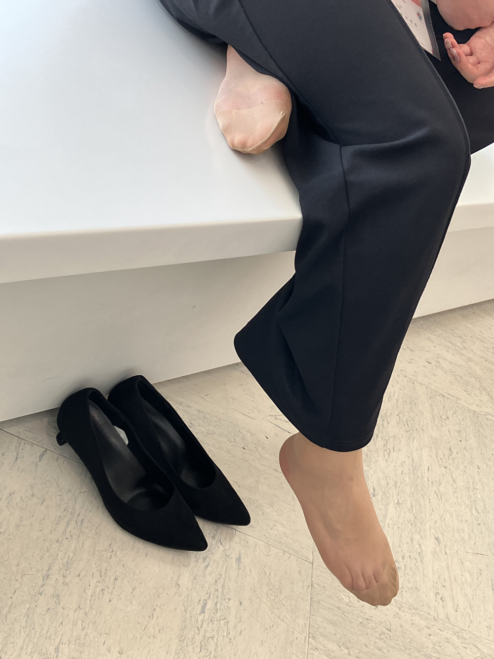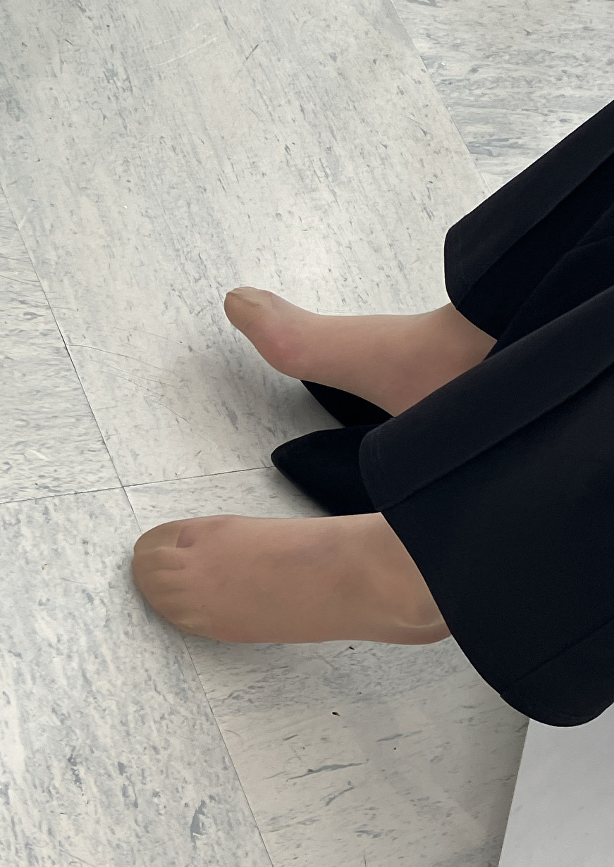 キリッとした美形の展示員さん、両足とも黒パンプスを脱いでスト足全開で休憩中です。つま先補強の三日月までクッキリ。日当たり良く暖かい中、ストッキングのつま先や足裏までみせながらスマホに集中です。