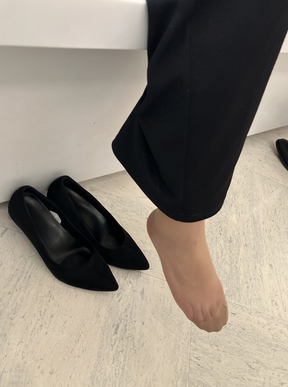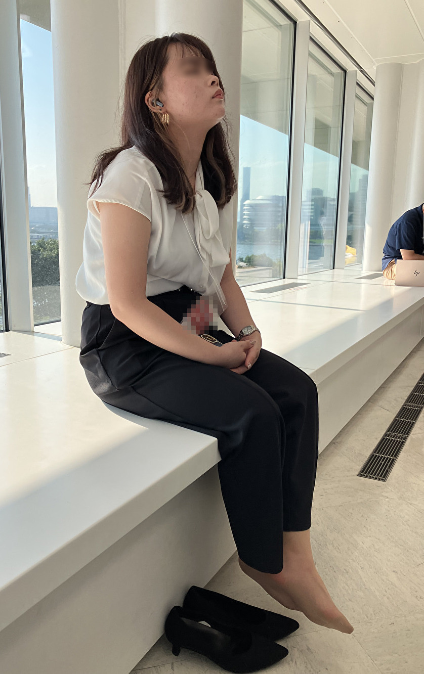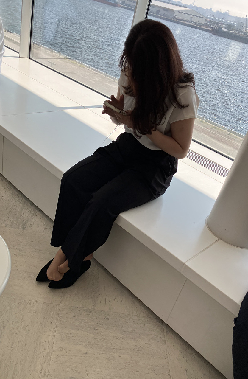 キリッとした美形の展示員さん、両足とも黒パンプスを脱いでスト足全開で休憩中です。つま先補強の三日月までクッキリ。日当たり良く暖かい中、ストッキングのつま先や足裏までみせながらスマホに集中です。