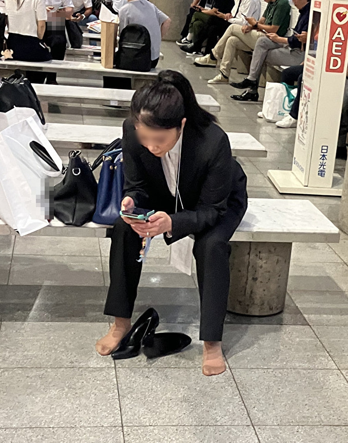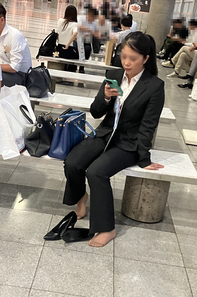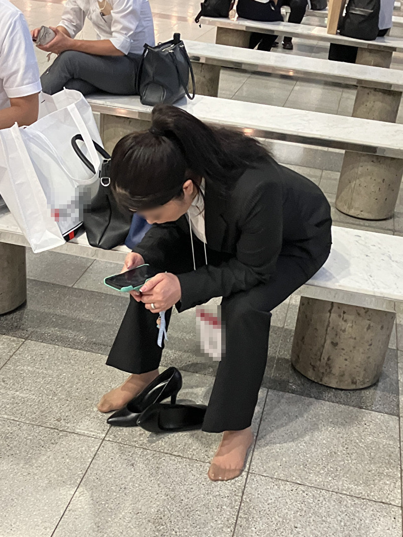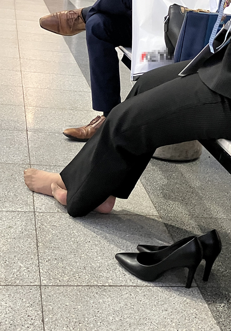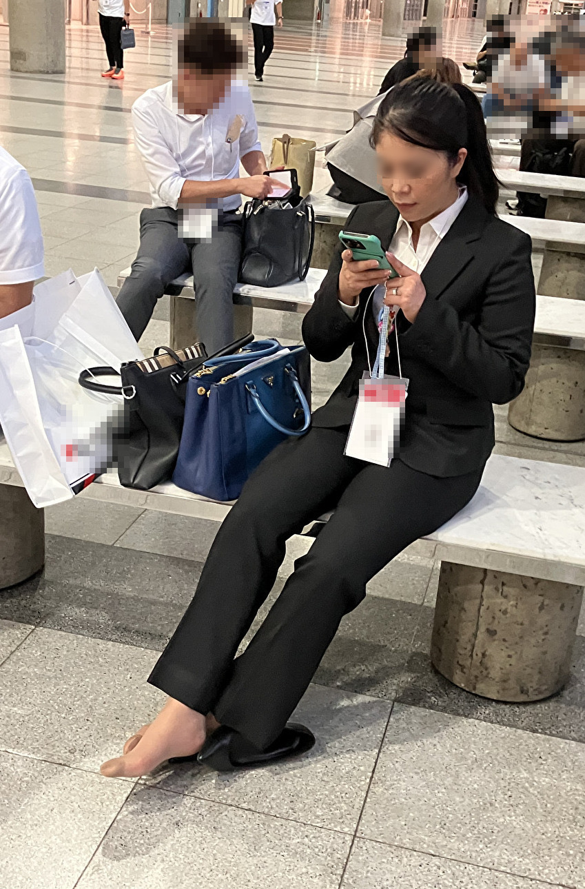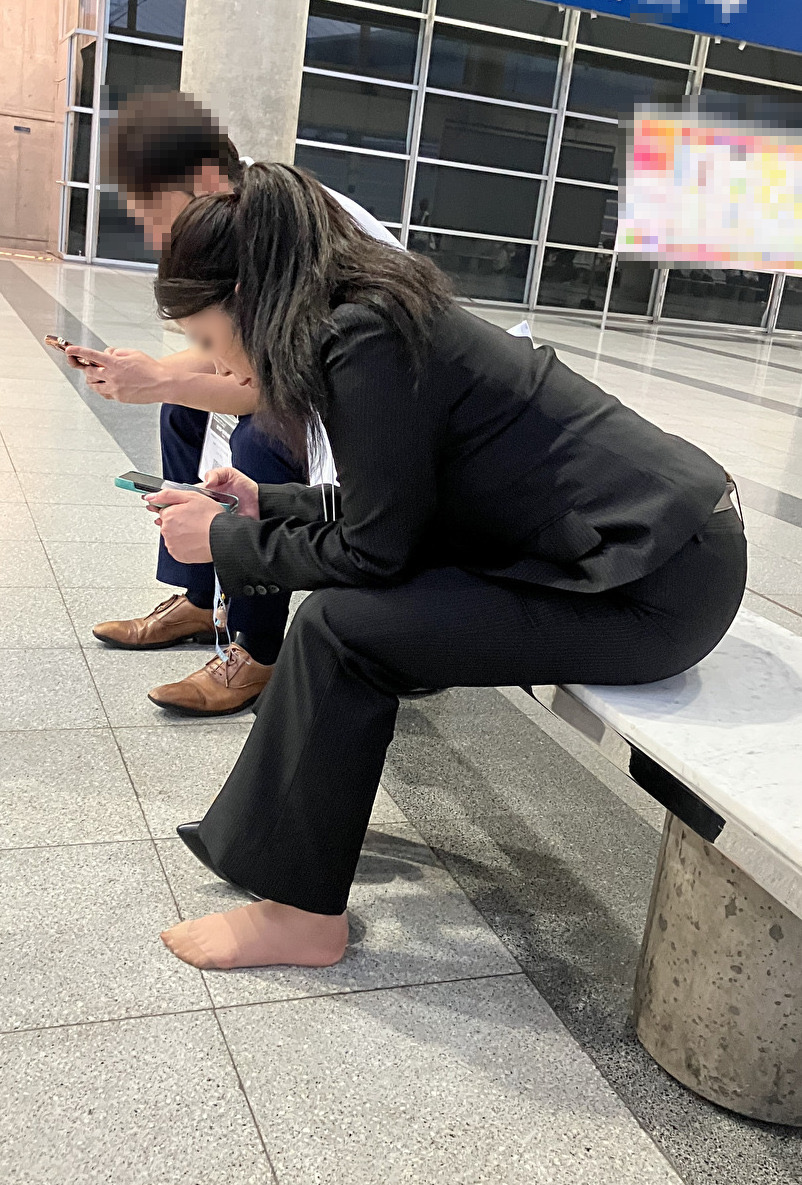 展示会場のベンチにて。パンツスーツ姿で黒パンプスのお嬢さん、両足全脱ぎで両スト足とも床にべったりでした。夕方だったんで写りがイマイチですが、凄い姿でした。どうぞ。