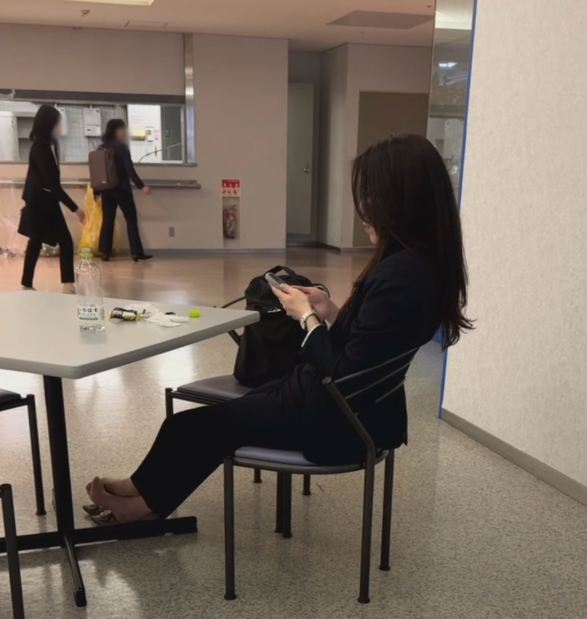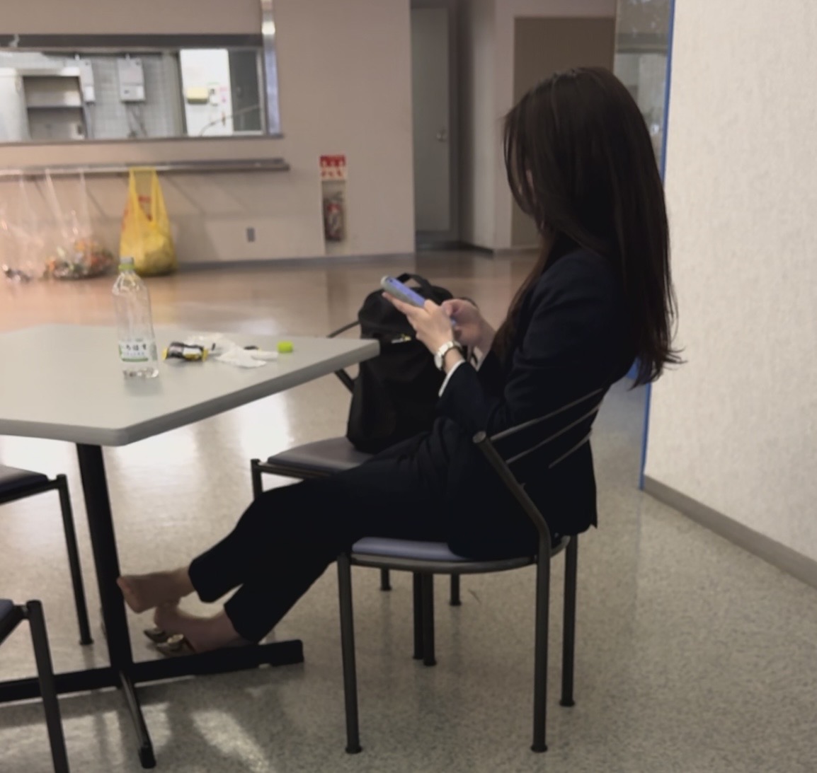 就活生が休憩中にパンプス脱ぎしておりました。友達も大胆に脱いでるシーンもしっかりと収めさせて頂きました。就活生は座った瞬間に脱ぐパターンが多いと感じます。後靴擦れして歩き方が少し変な感じになってる方は座った瞬間脱ぐ方が多いですね。