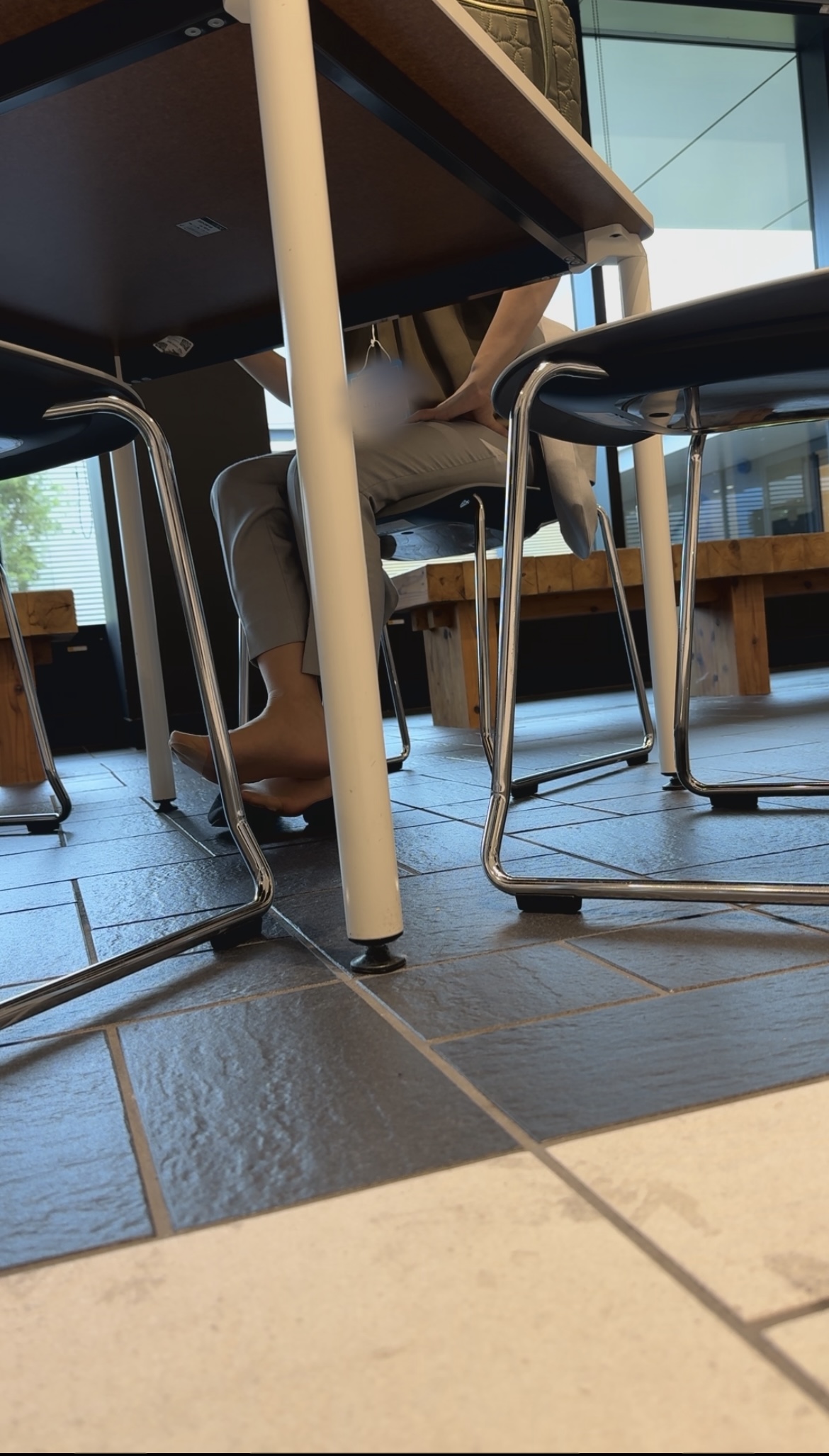 可愛いお嬢さんですね。パンプス脱いだスト足をガン見されているとも知らず、油断されてますね。最高です。ありがとうございます。