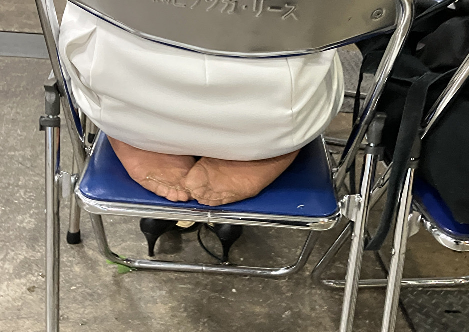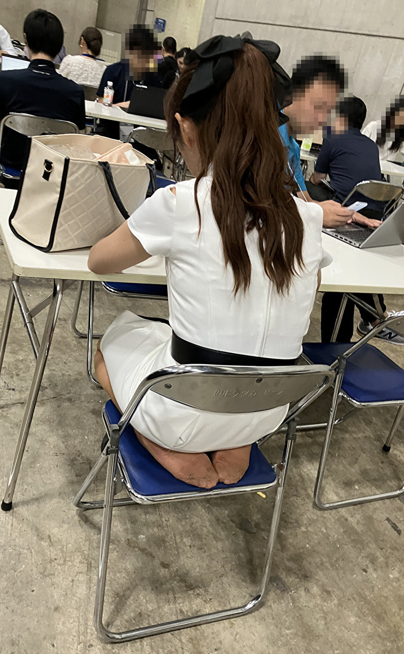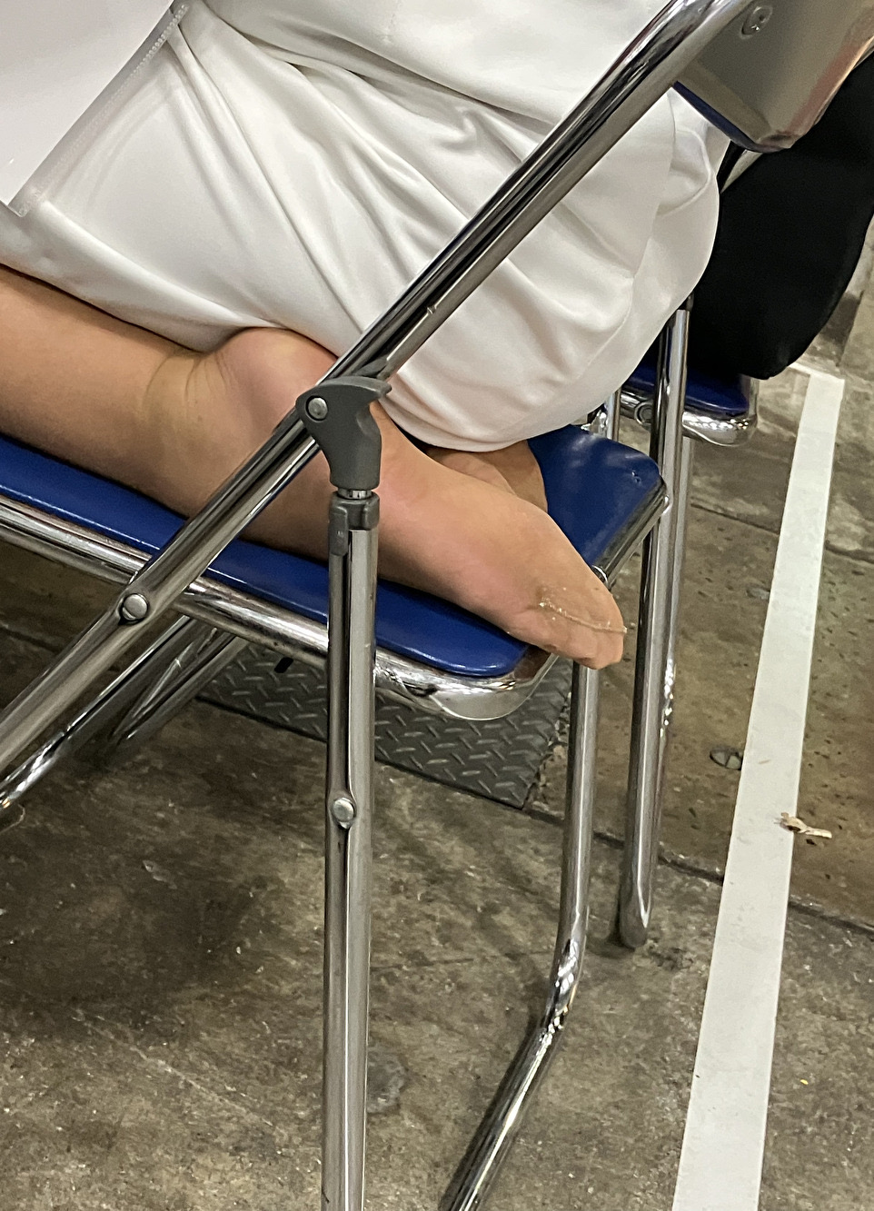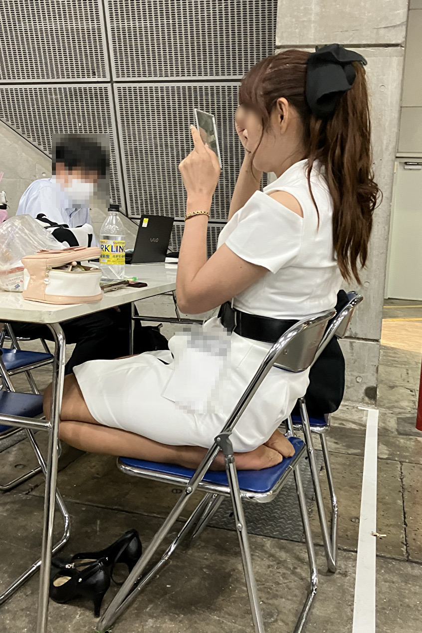 珍しい光景です。スカート姿のコンパニオンのお嬢さんがパイプ椅子の上で正座で休憩してました。当然ストッキングの両足とも足裏全開で、脱いだパンプスは床に揃えられていました。凄くドキドキしました。