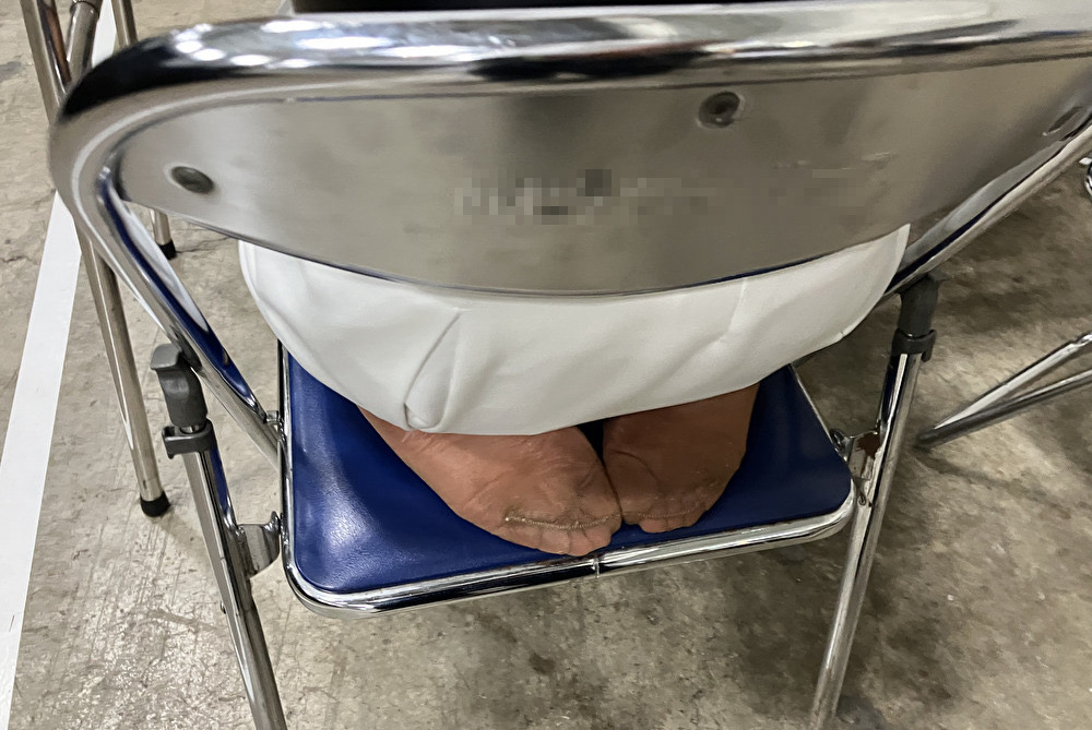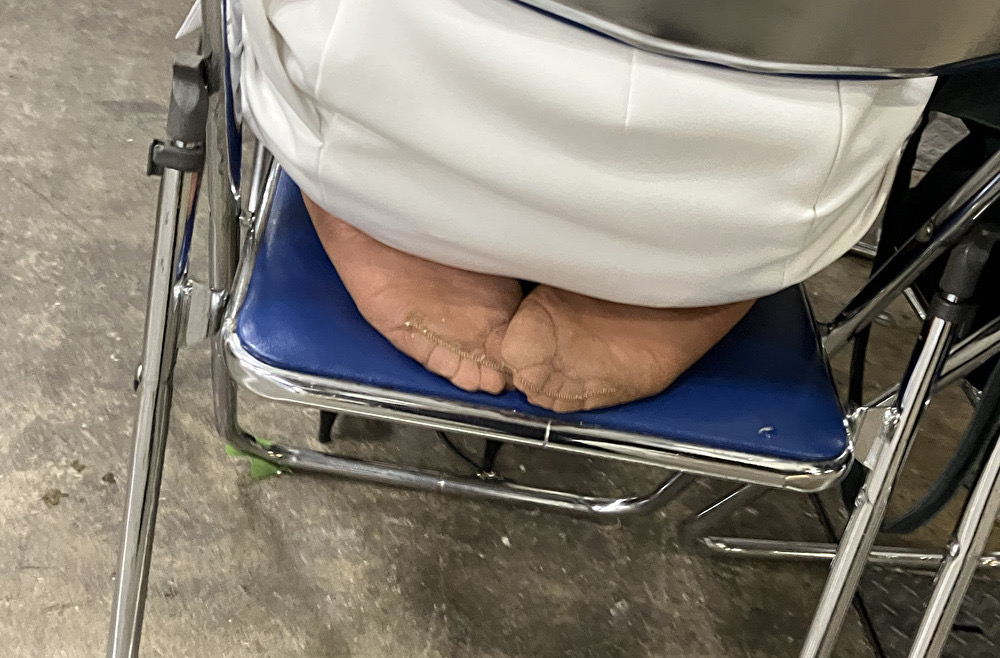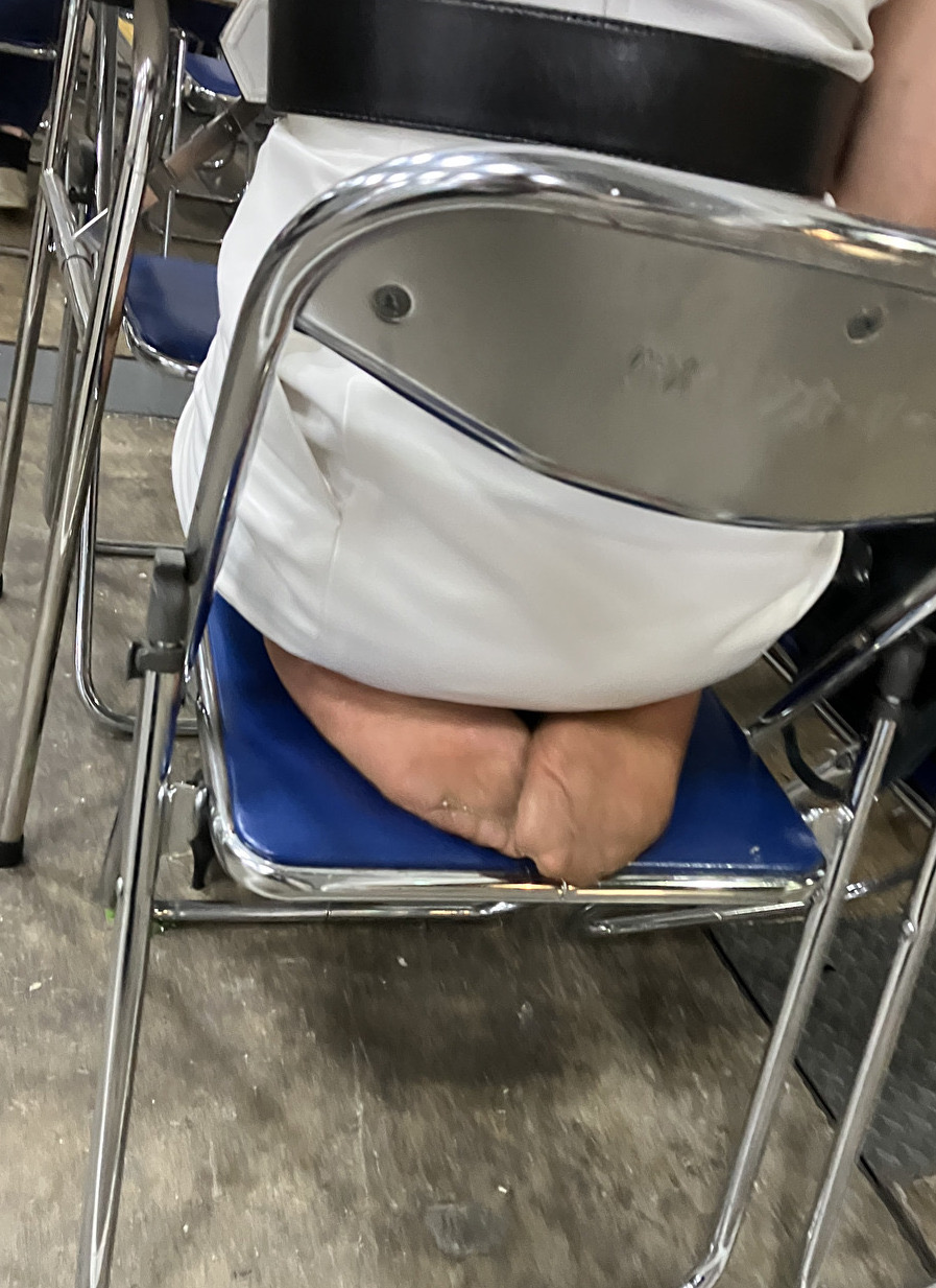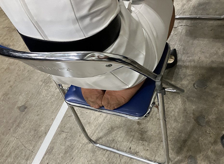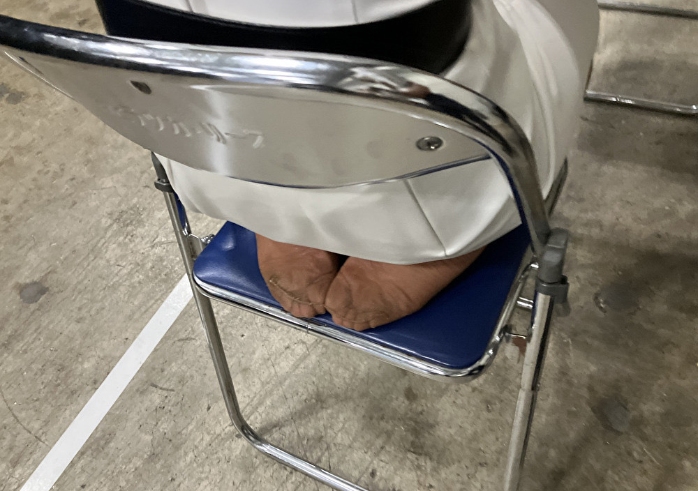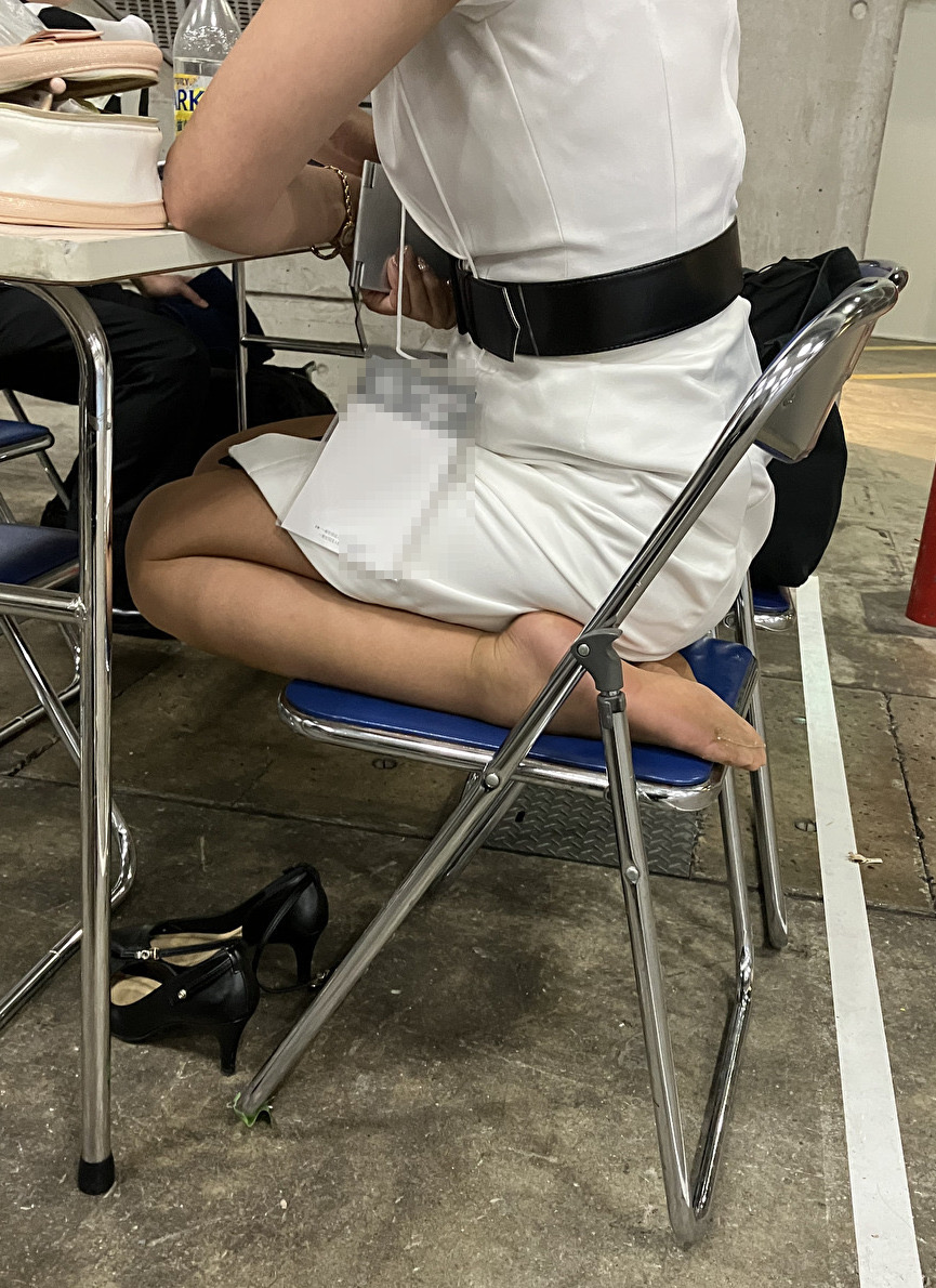 珍しい光景です。スカート姿のコンパニオンのお嬢さんがパイプ椅子の上で正座で休憩してました。当然ストッキングの両足とも足裏全開で、脱いだパンプスは床に揃えられていました。凄くドキドキしました。