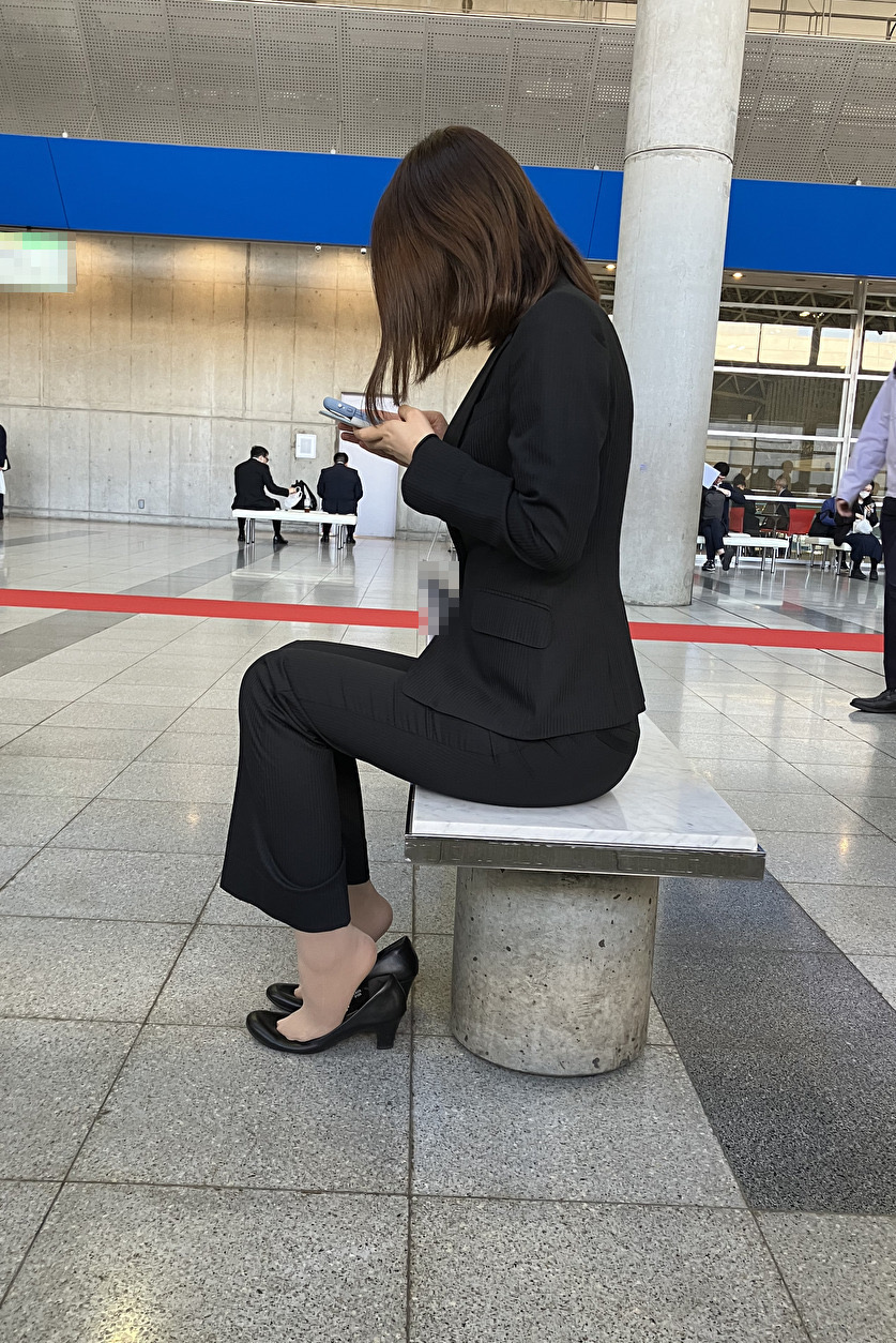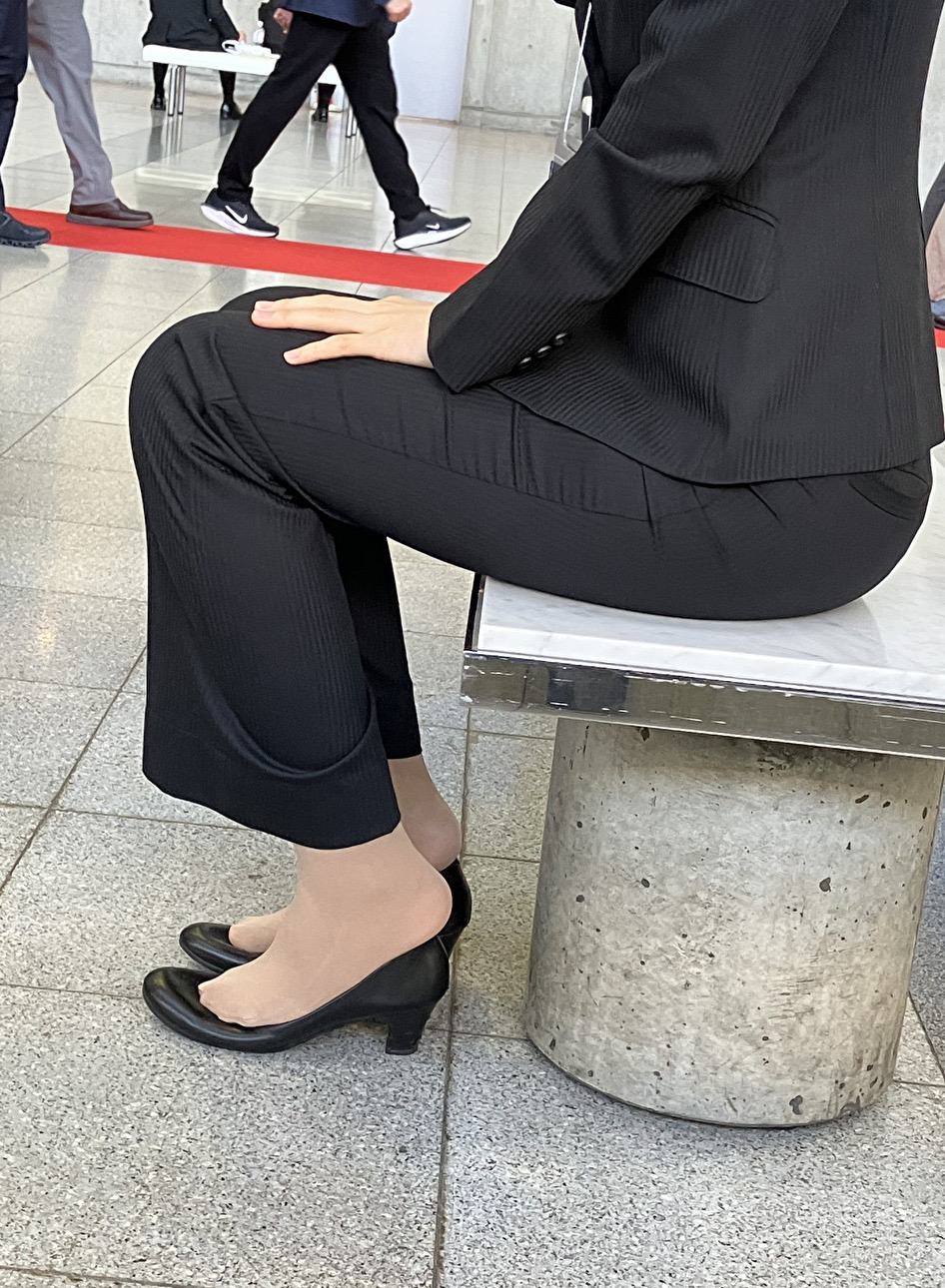 お洒落なスーツ姿の美人出展員さんが、休憩中にパンプスを半抜きでスト足を見せつけていました。バッチリつま先部分も撮れました。よろしくお願いします。(1アングルで恐縮です。)