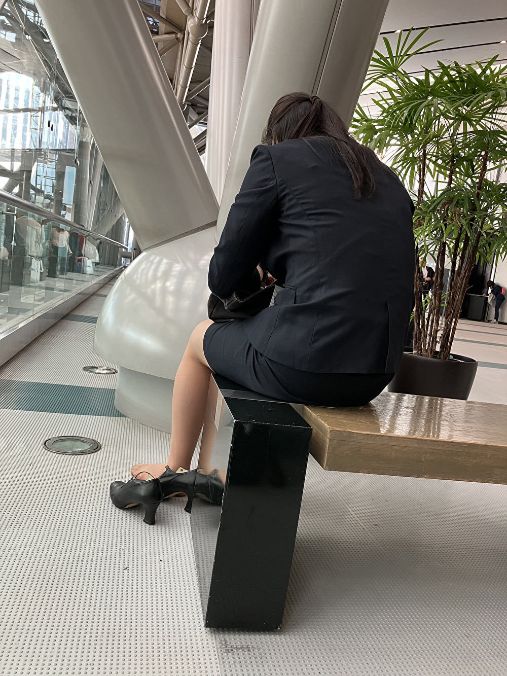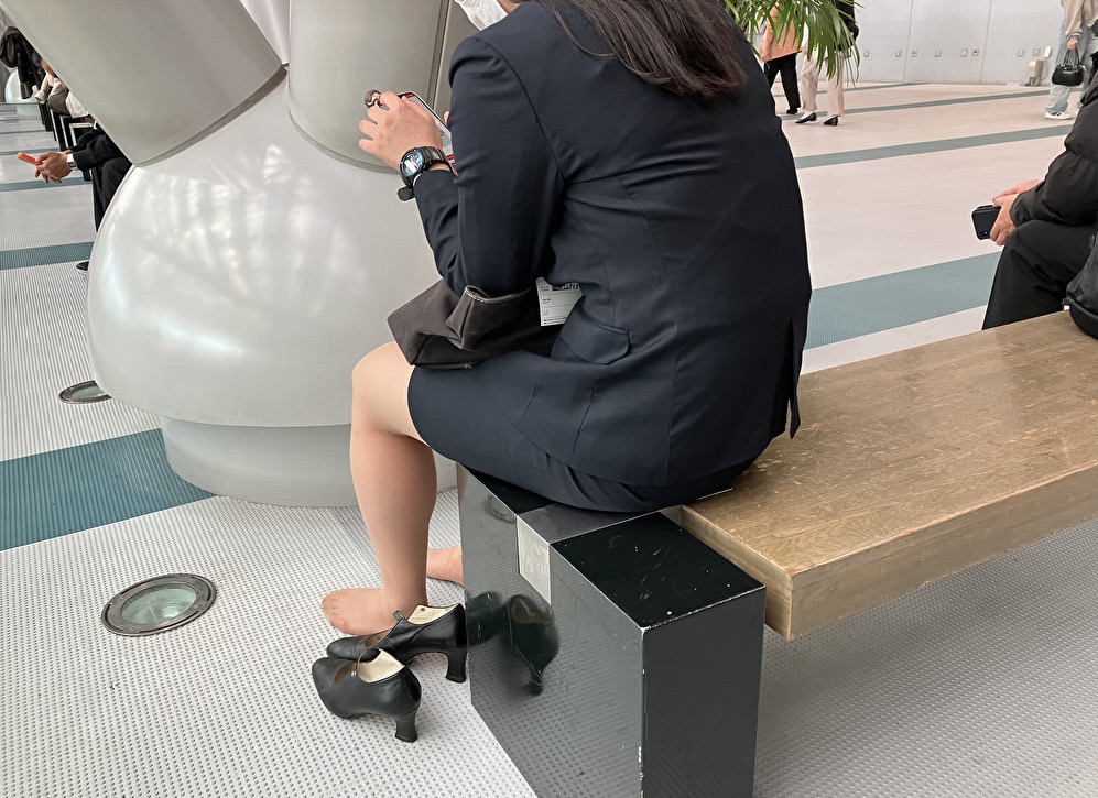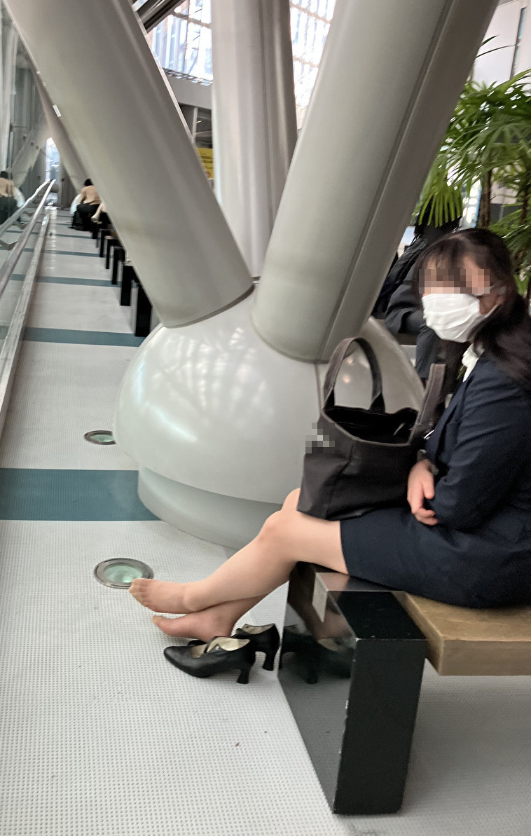 久しぶりにしっかり両足パンプス脱ぎで、両スト足を床にベッタリ置いて休んでいる、スーツ姿の展示員さんを発見しました。良い場所は、すでに他の方が座っていたので、あまり良い出来ではないですが、程よいストッキングの色や、つま先三日月がちゃんと撮れるよう頑張ったつもりです。