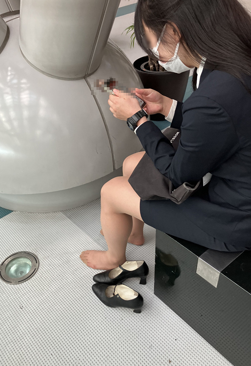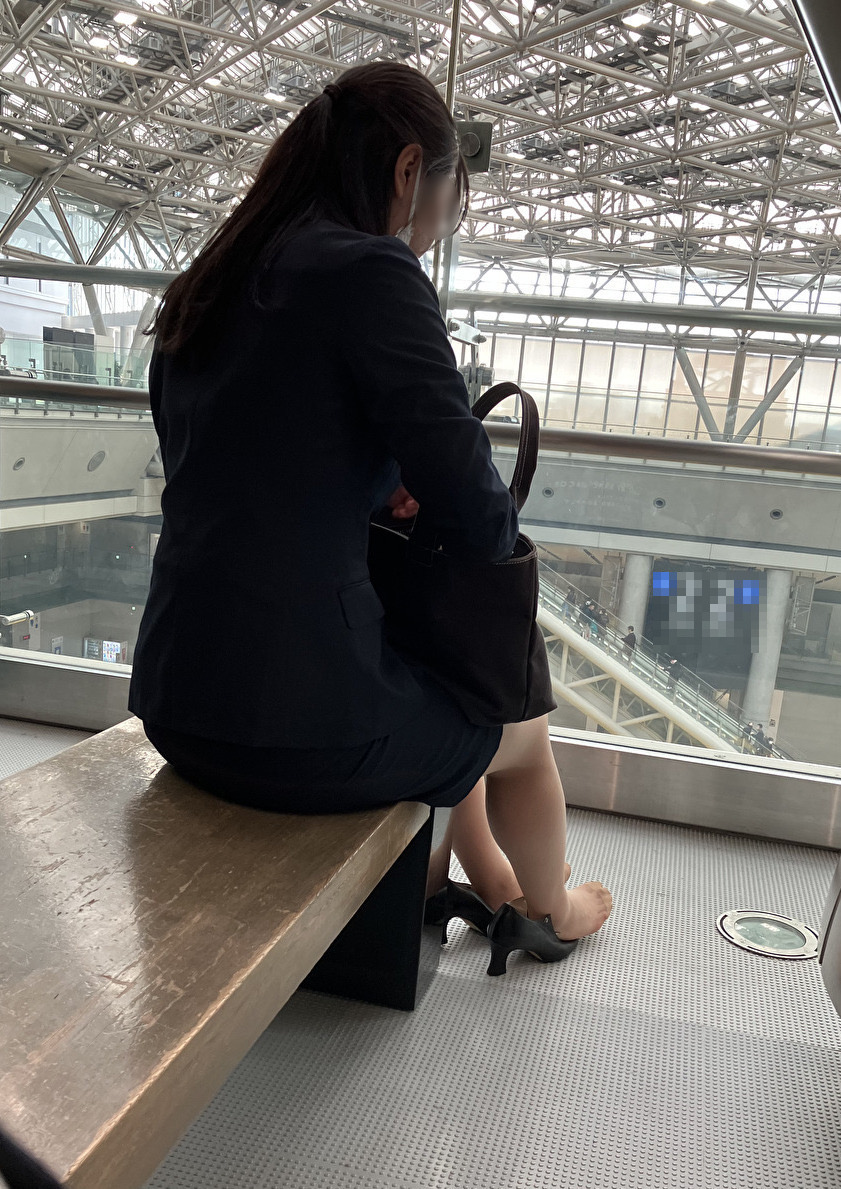 キリッとした美形の展示員さん、両足とも黒パンプスを脱いでスト足全開で休憩中です。つま先補強の三日月までクッキリ。日当たり良く暖かい中、ストッキングのつま先や足裏までみせながらスマホに集中です。