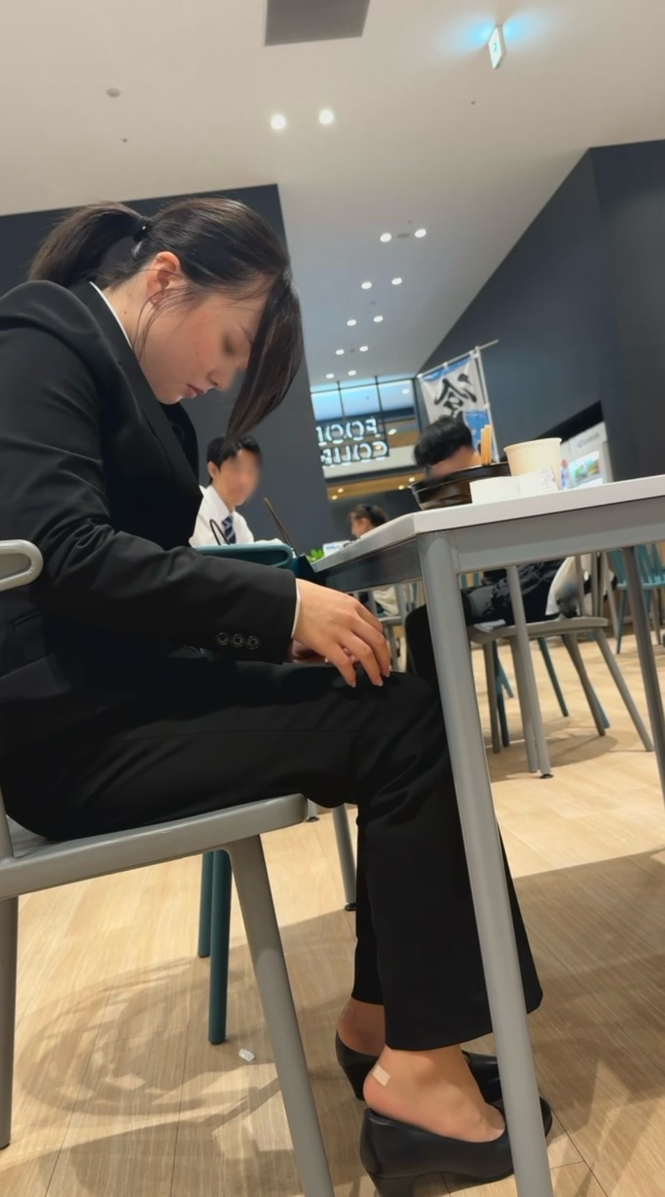 就活イベントで疲れたのか、パンプス脱いで解放させてました。踵が痛いのか絆創膏貼ってる時に大胆に脱いでました。お納めくださいませ。