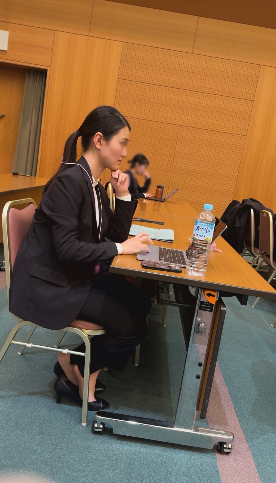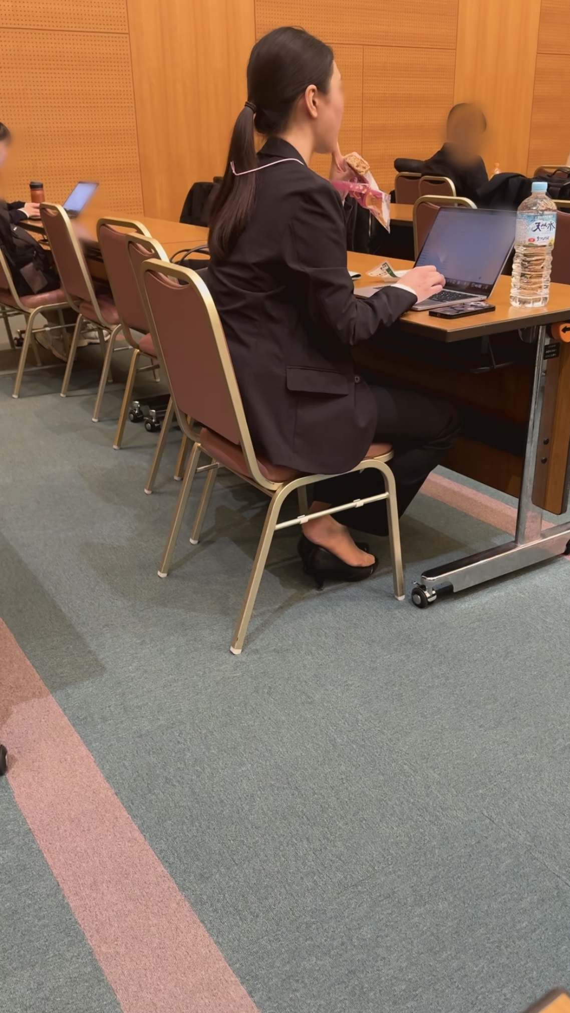 横顔が綺麗な美人出展員がパンプス半脱ぎでお仕事しておりました。一瞬全脱ぎしましたが、そこからはずっと半脱ぎ状態でした。個人的にパンプス半脱ぎもグッとくるシチュエーションですね。