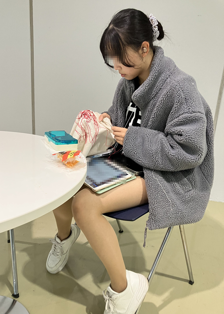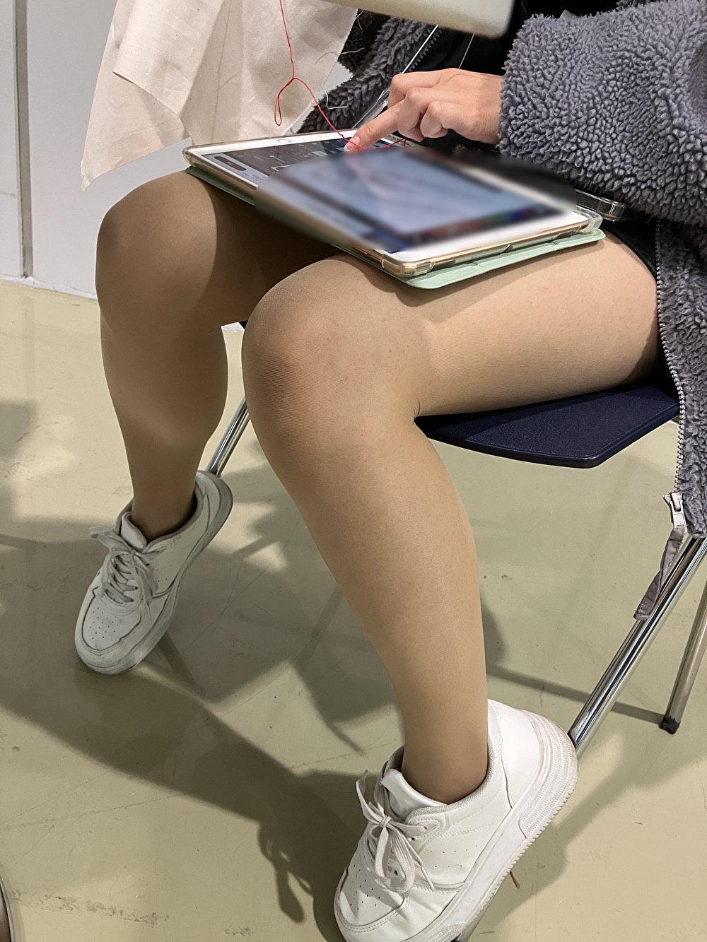 脱ぎはないのですが、明るい休憩所でお休み中のコンパニオンのお嬢さんの美脚を包むストッキングの繊維まで撮れたのでご覧ください。