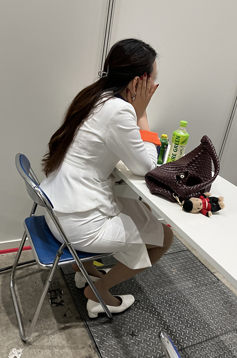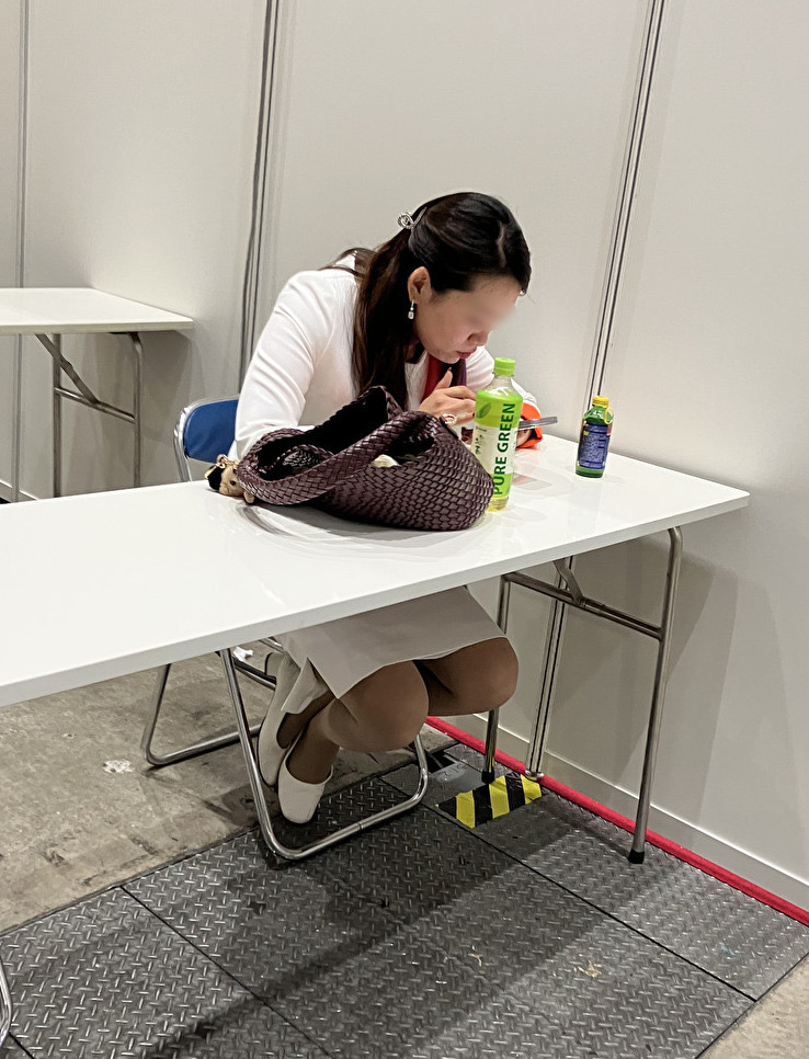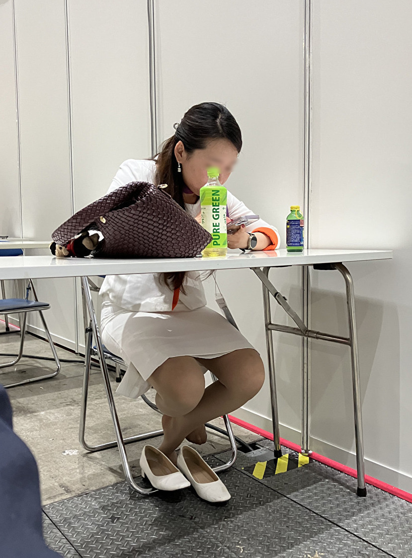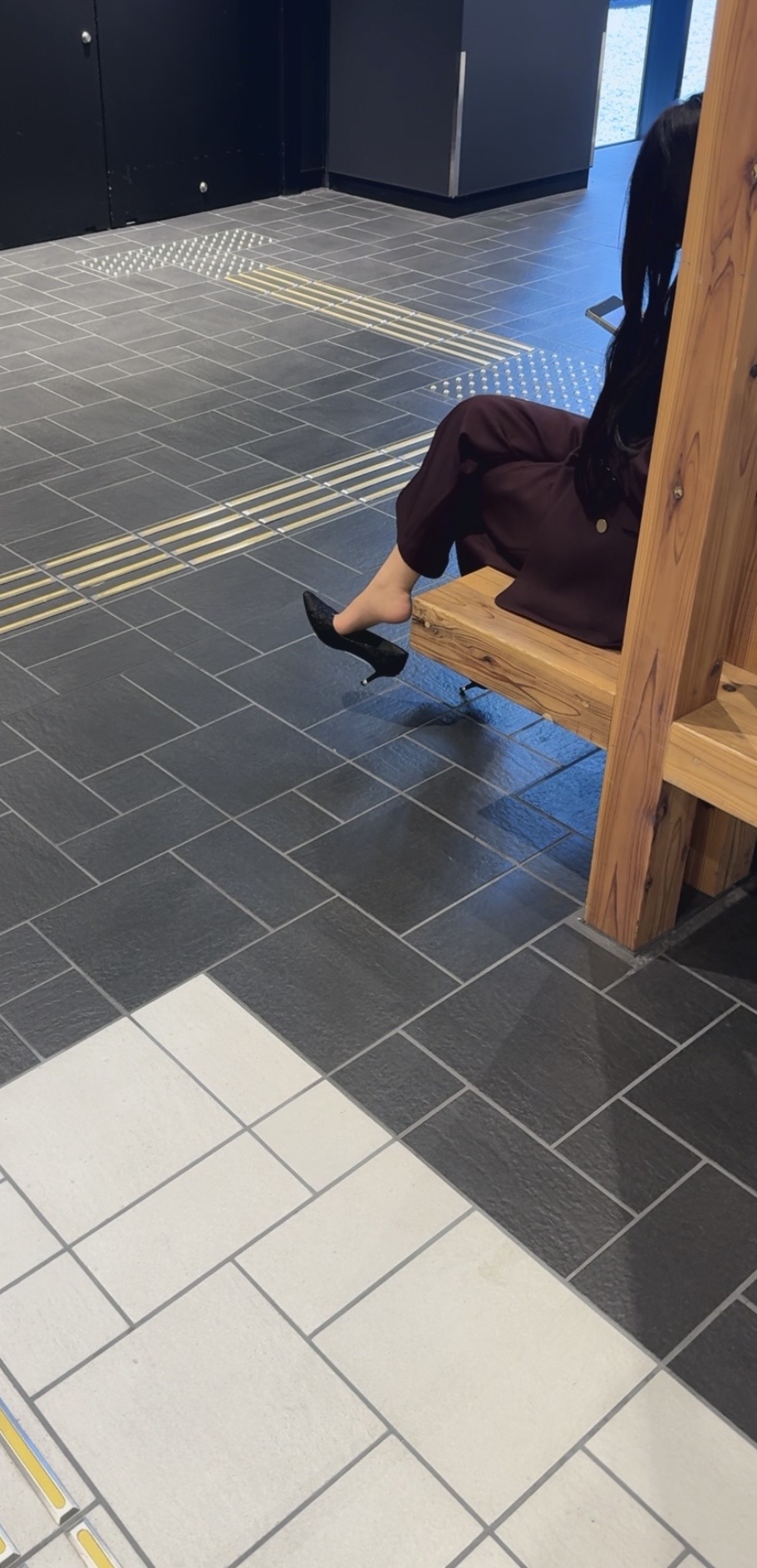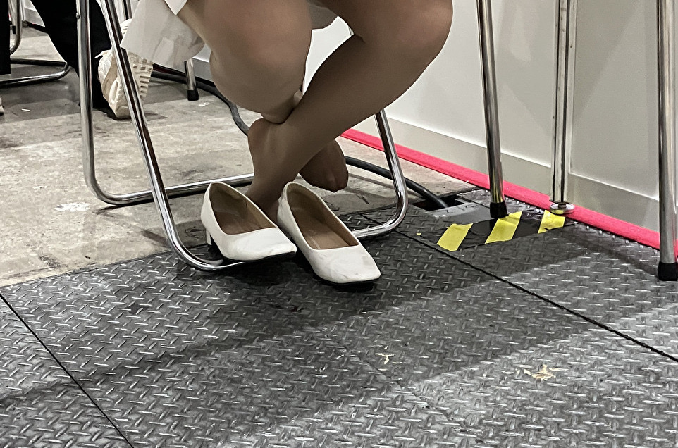 某〇〇保険の出展員さんがパンプスを半脱ぎしておりました。横顔が綺麗な方で、つま先は無しですが収めさせて頂きました。