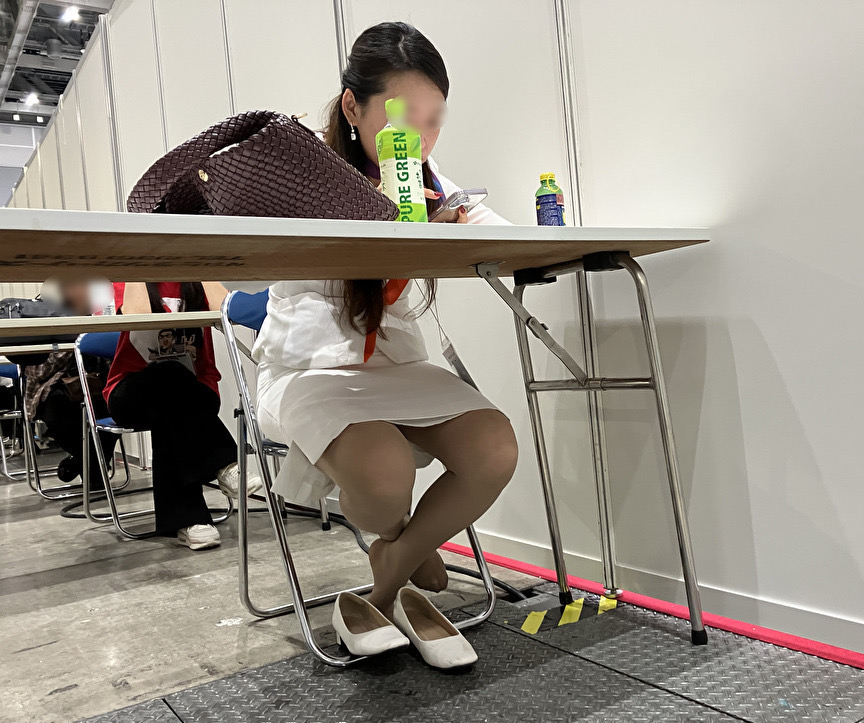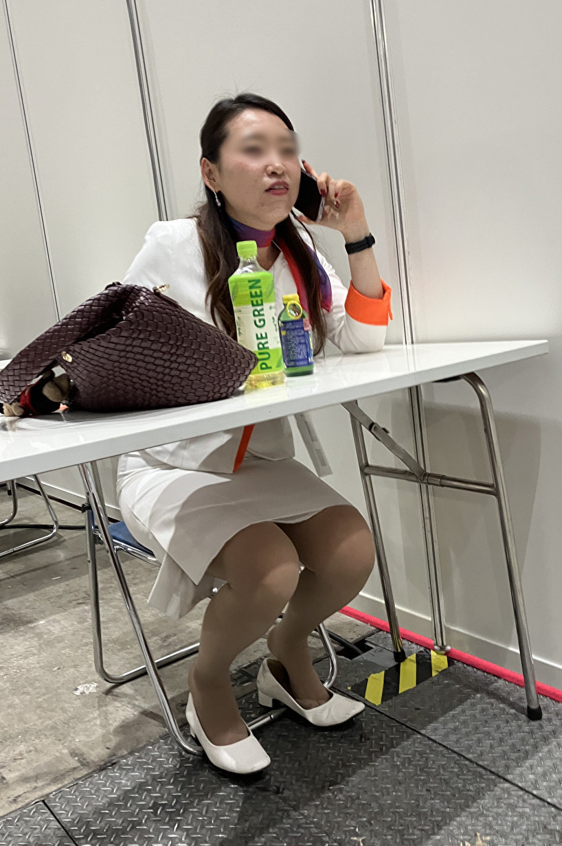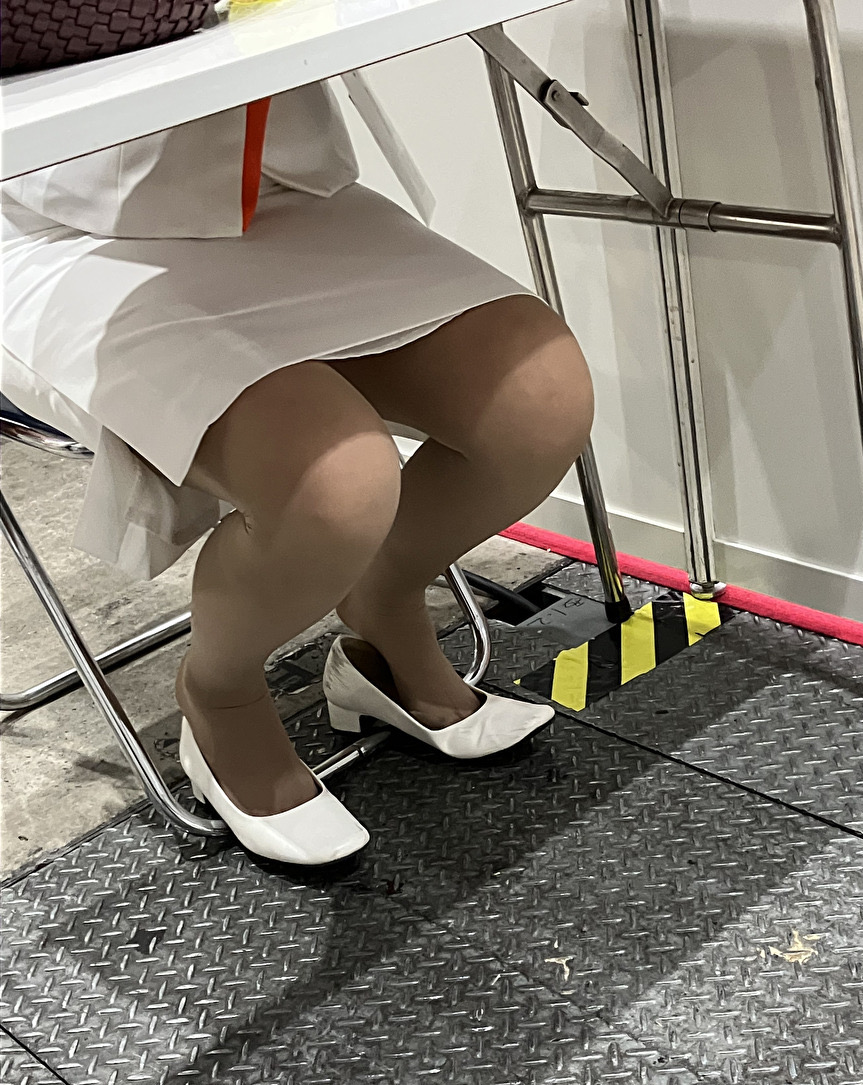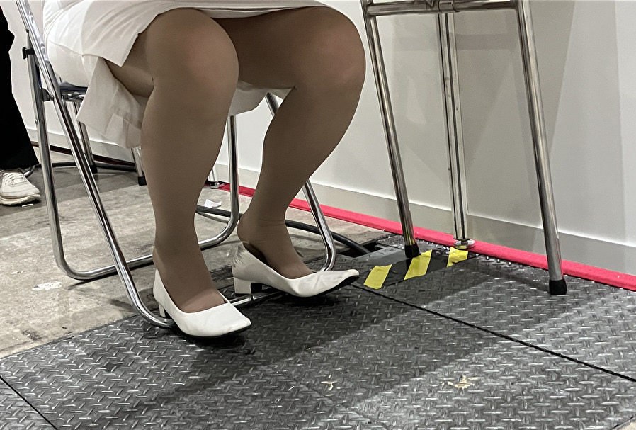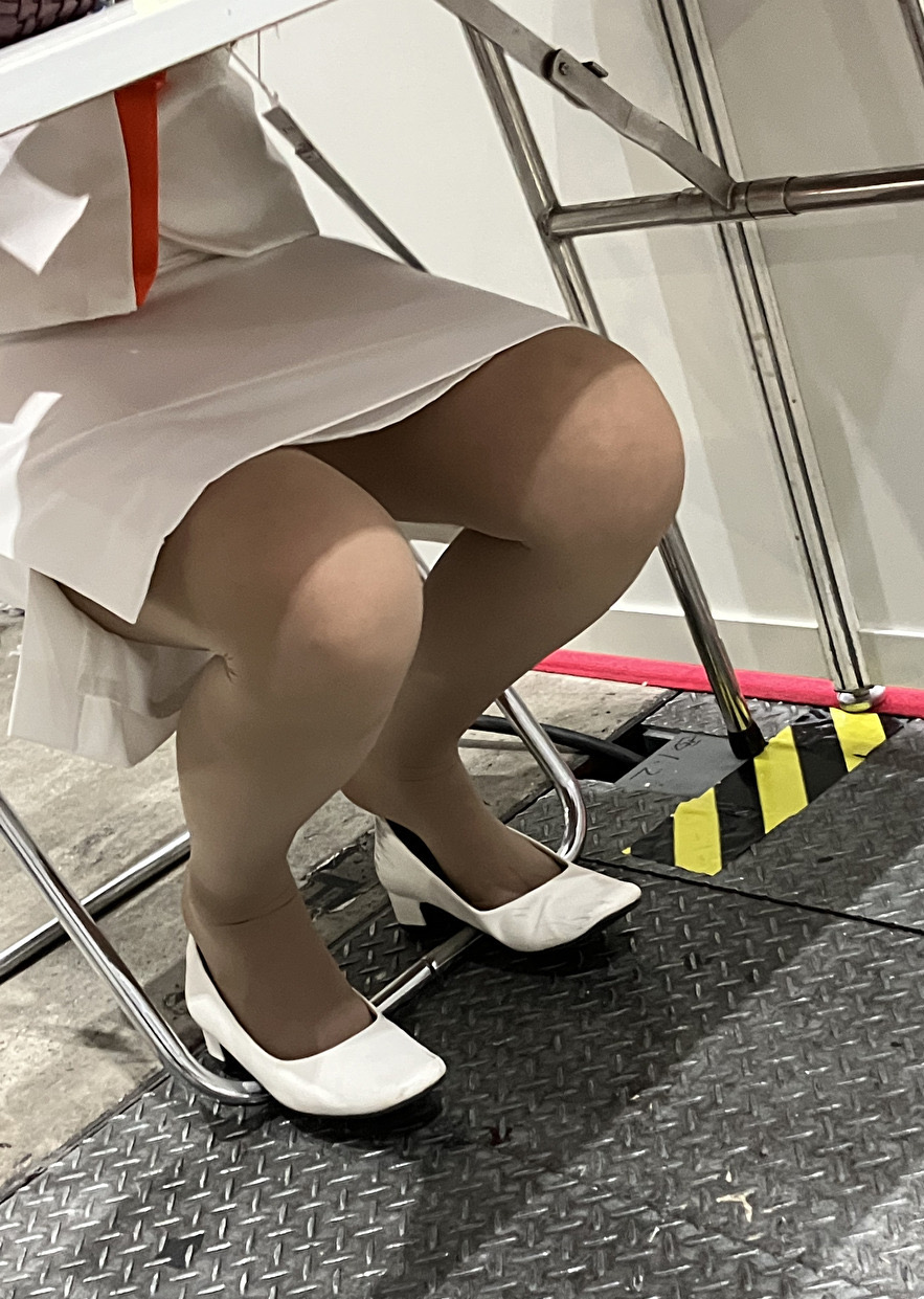 美形美脚のコンパニオンのお嬢さん、休憩中です。ストッキング足が徐々に白パンプスから抜け出てきます。脱ぎまでは行きませんでしたが、お休み中の白パンプスとスト足の隙間が、なんとも魅力的でした。