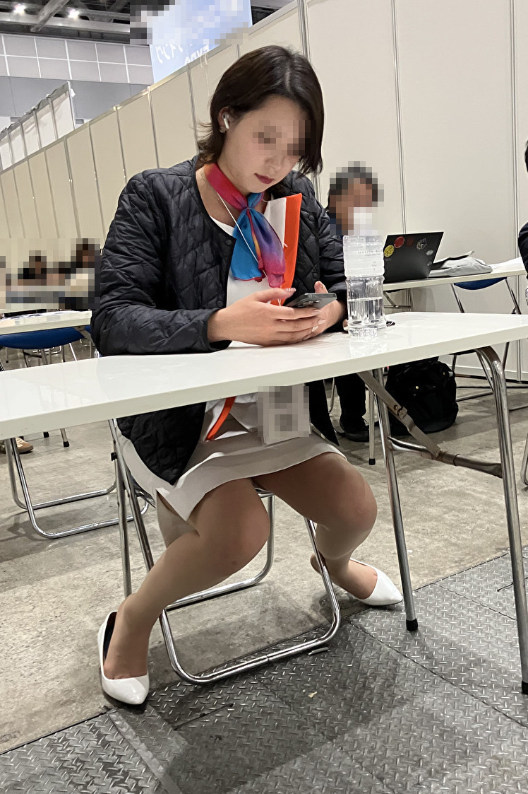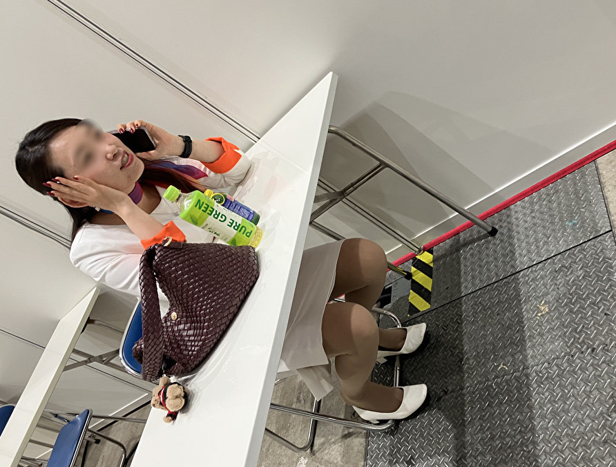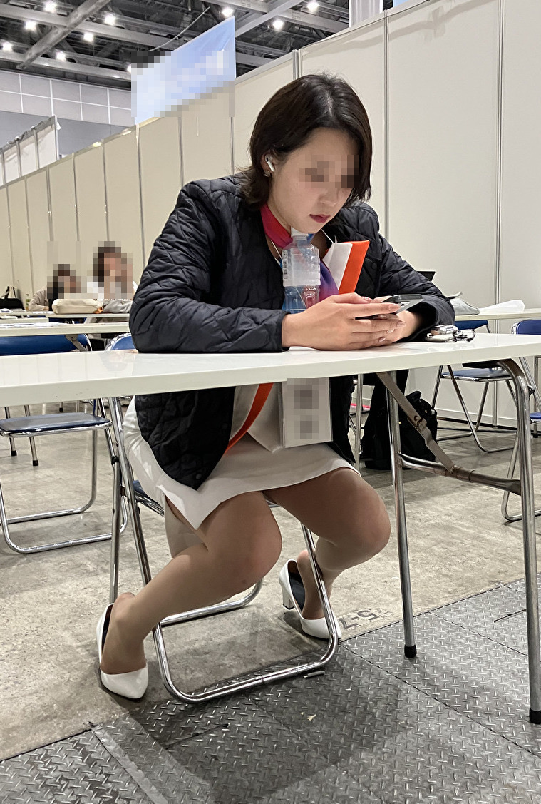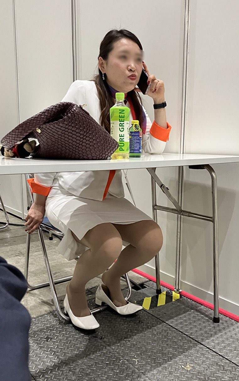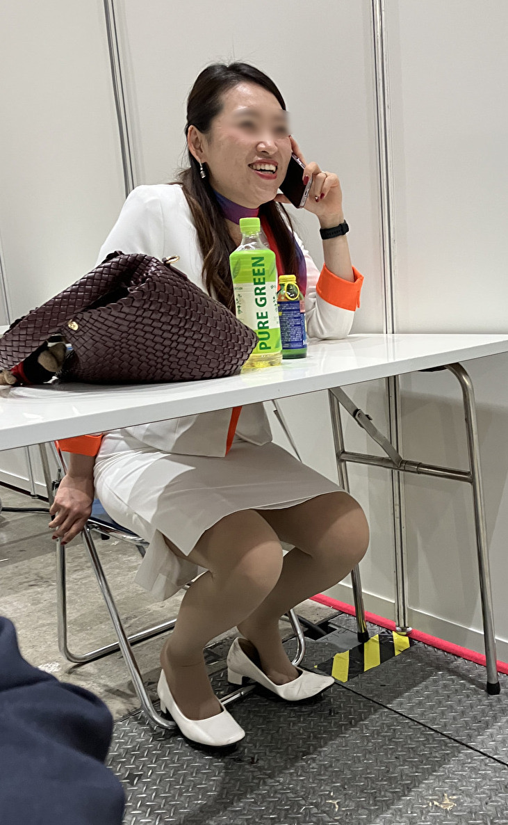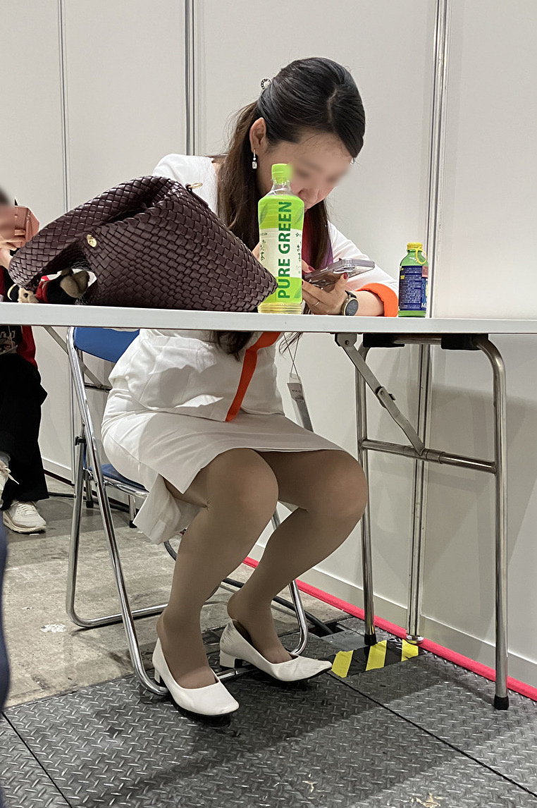 美形美脚のコンパニオンのお嬢さん、休憩中です。ストッキング足が徐々に白パンプスから抜け出てきます。脱ぎまでは行きませんでしたが、お休み中の白パンプスとスト足の隙間が、なんとも魅力的でした。