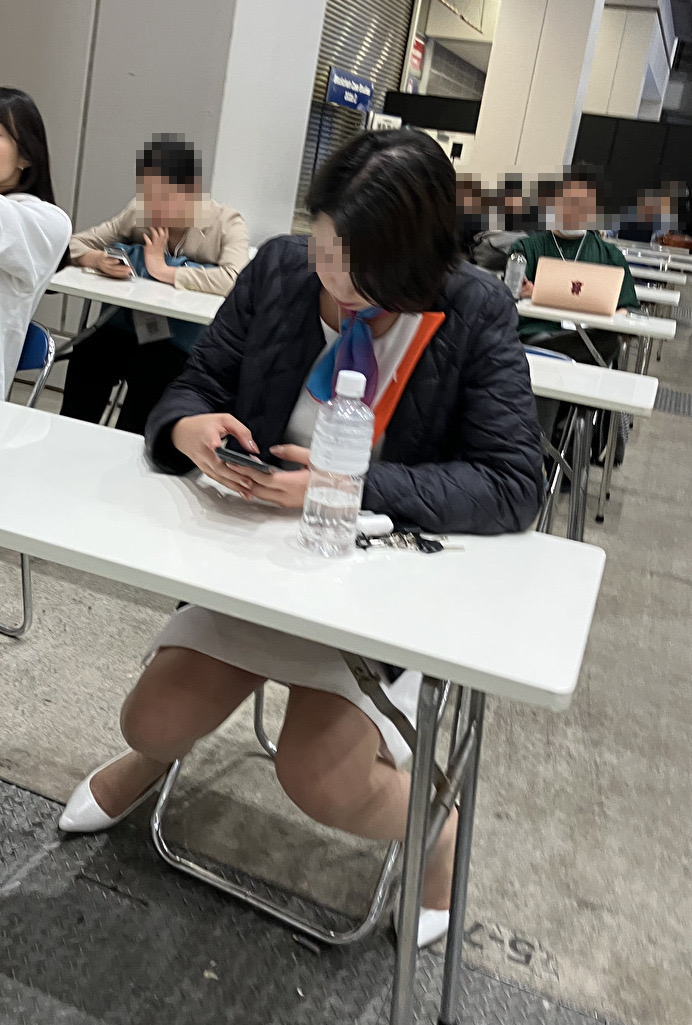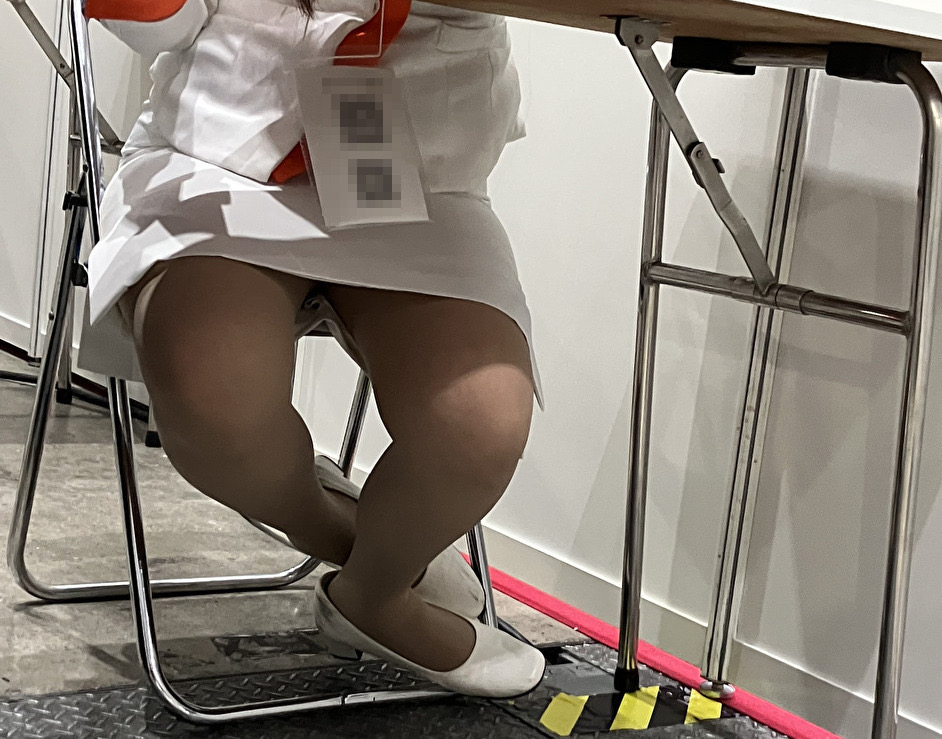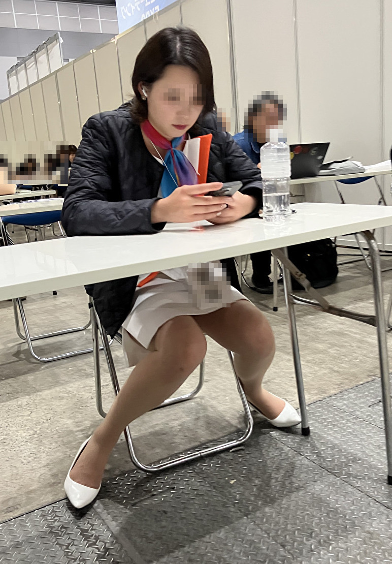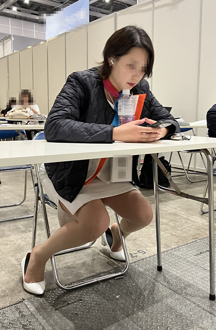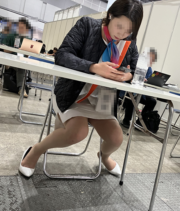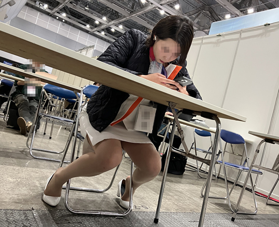 美形美脚のコンパニオンのお嬢さん、休憩中です。ストッキング足が徐々に白パンプスから抜け出てきます。脱ぎまでは行きませんでしたが、お休み中の白パンプスとスト足の隙間が、なんとも魅力的でした。
