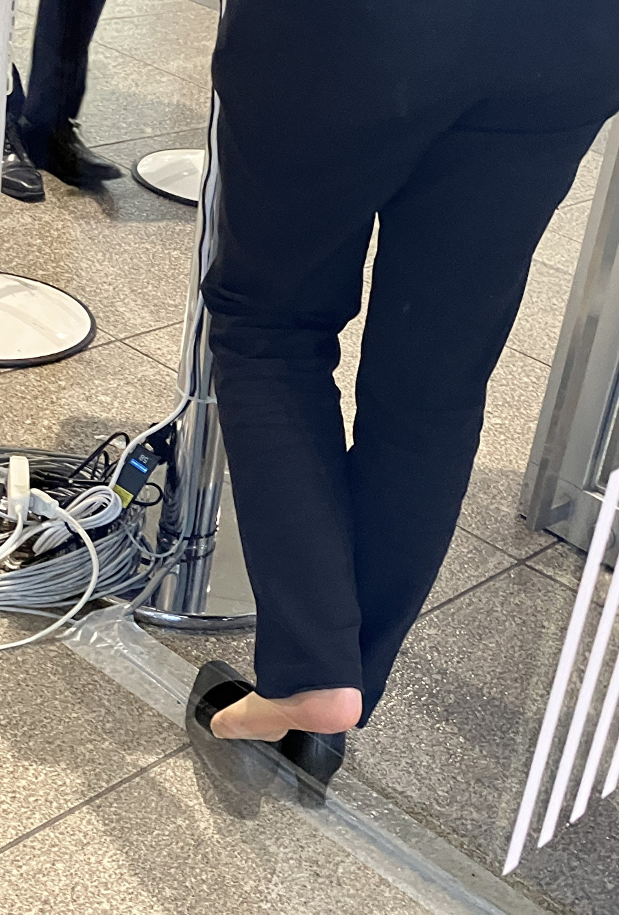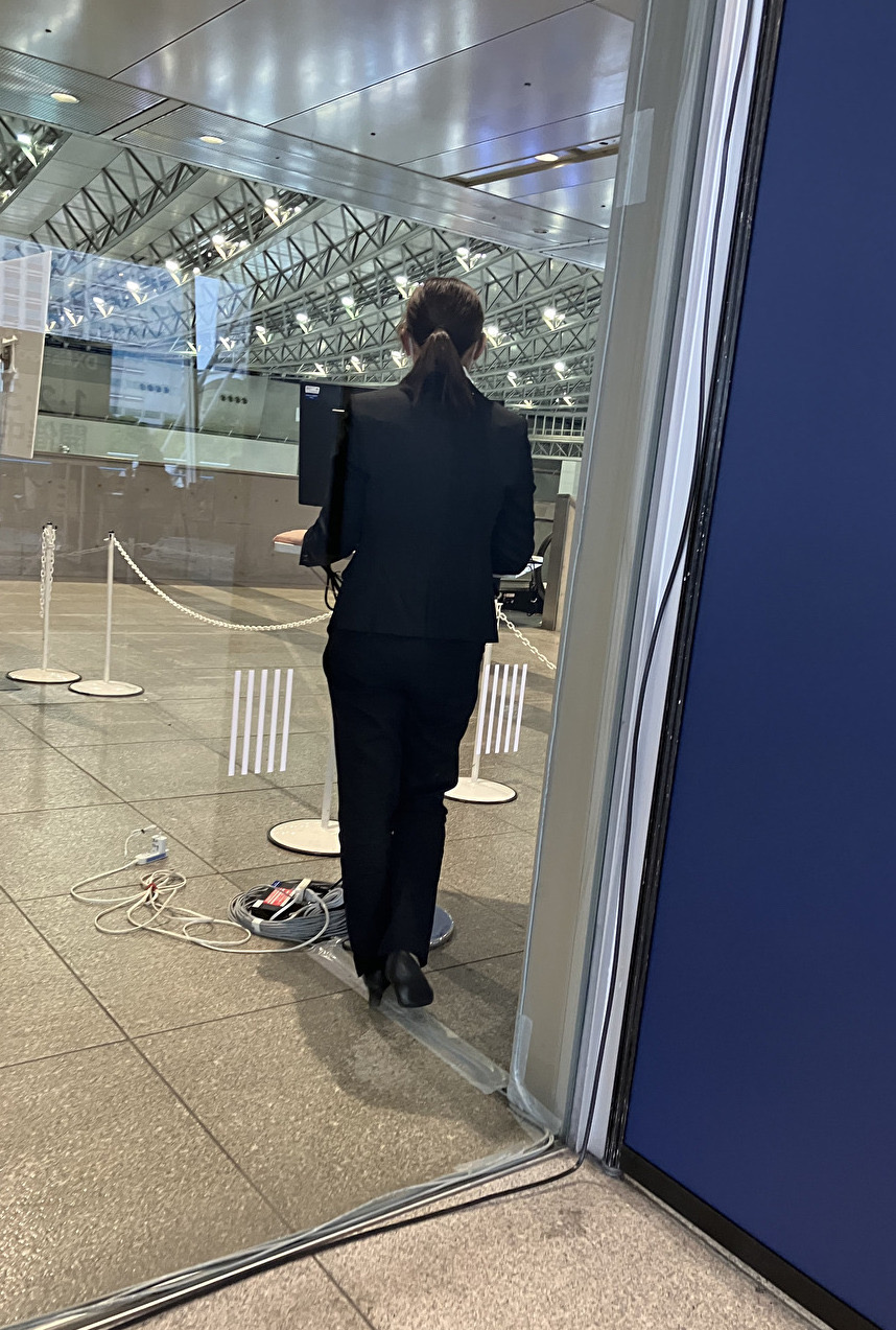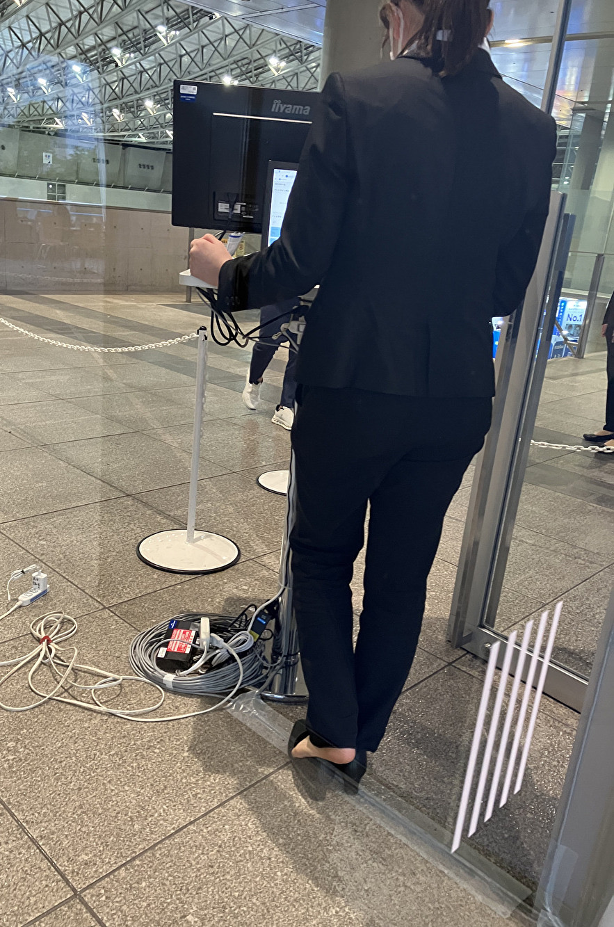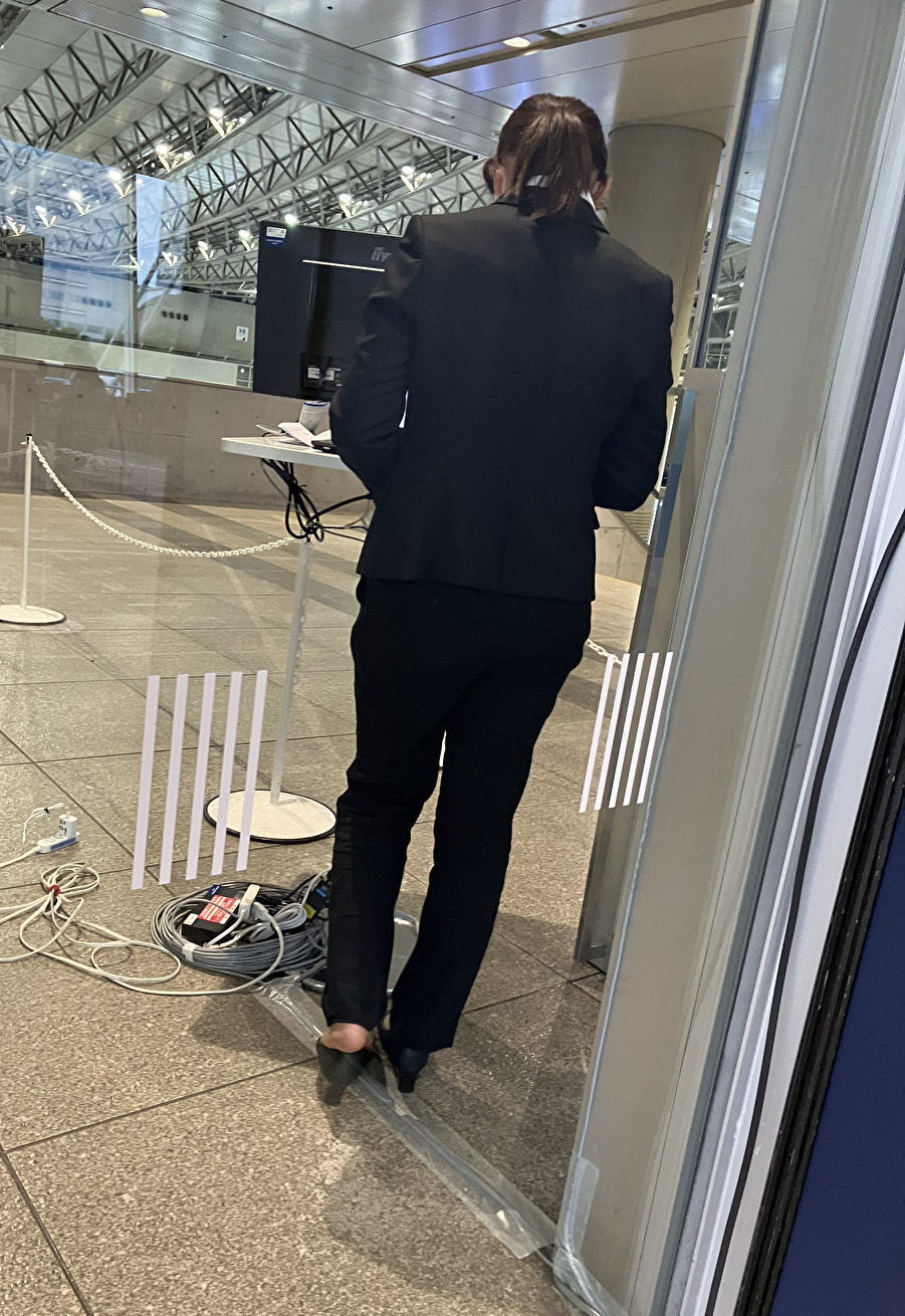 ガラス越しに撮りました。パンツスーツの展示会スタッフのお嬢さん、立ち仕事で疲れたんでしょう、パンプス脱いでスト足抜き出すたびに湿気っぽい匂いがまわりに漂ってそうです。