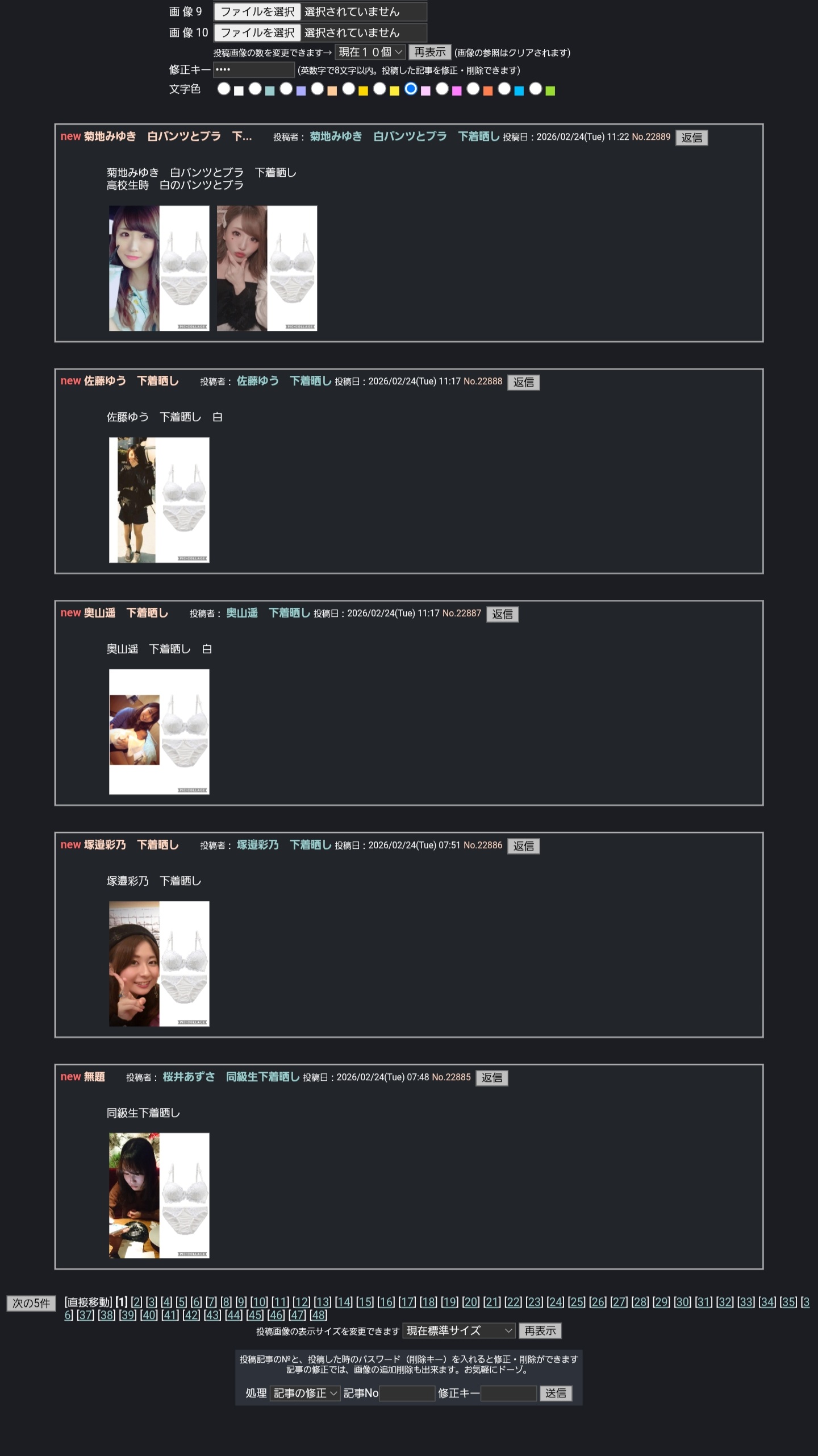 ■ 下着が写っている画像(パンチラ、下着にボカシ有でも禁止) ■ 胸部、臀部だけをアップにした画像 ■ 児童ポルノなどのわいせつ画像 ■ 誹謗、中傷など不快感を与える書き込み ■ その他管理人が不適切と感じた投稿は削除、アクセス制限します |