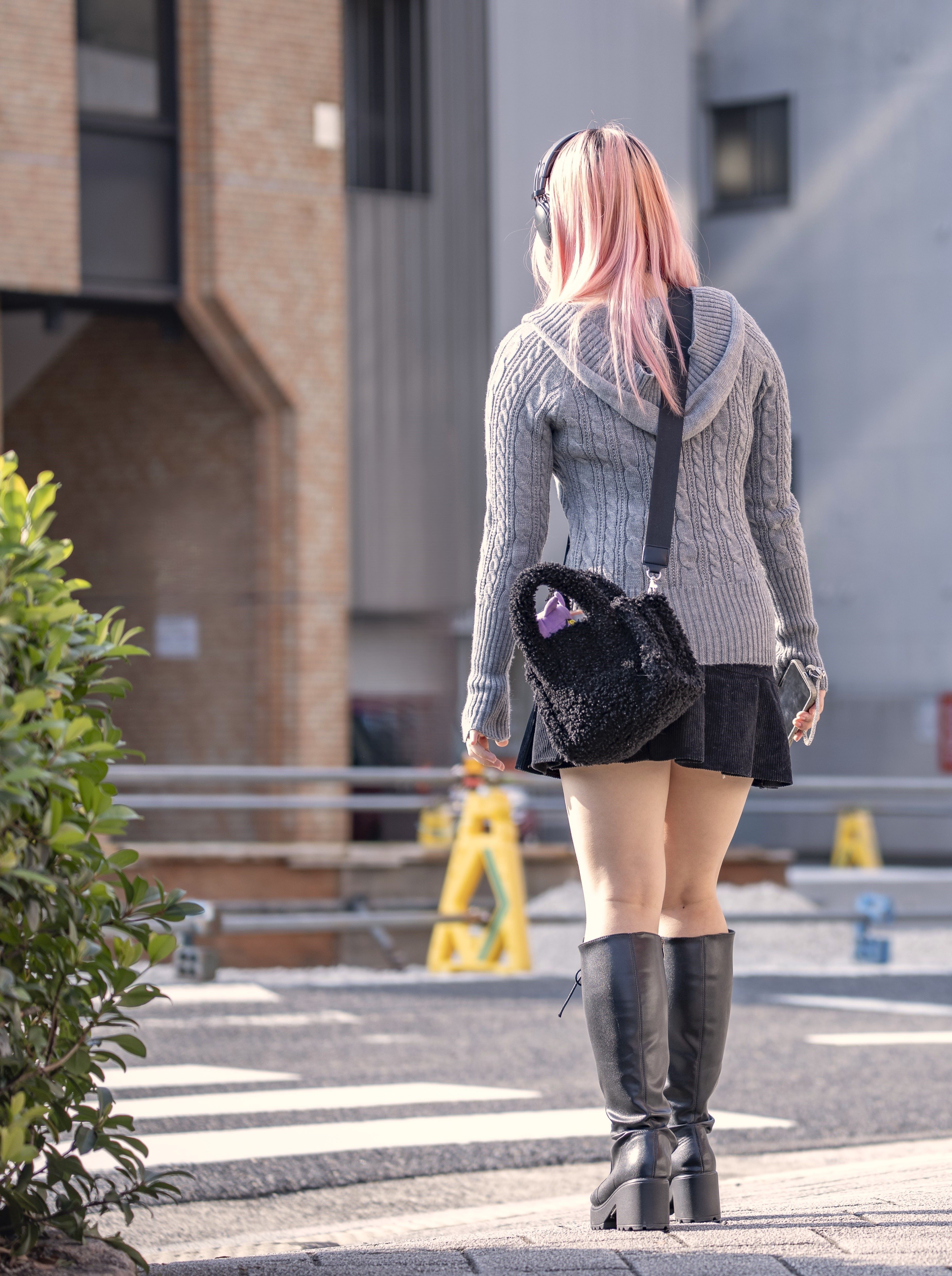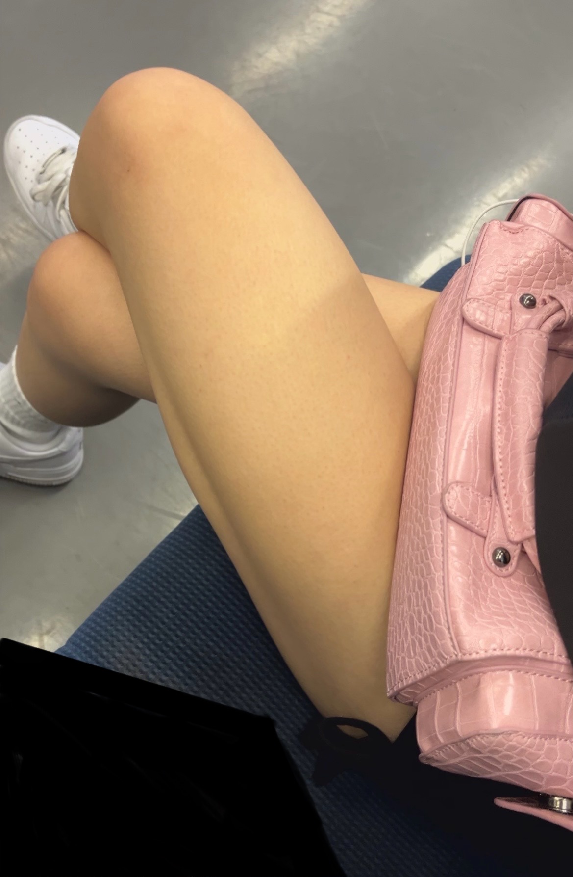 ピンクカバンが生脚を引き立てているように見えてしまい