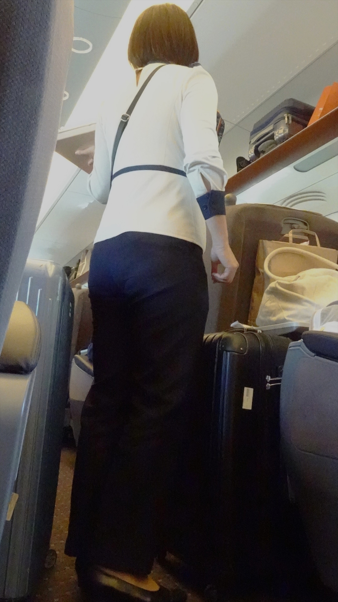 さすが野伏さんの撮影力です。指輪をつけているCAは、旦那専用ですね。一日乗務して何百人、何千人から視姦されたその黒パンスト脚は、夜には性玩具として旦那の性欲処理に使われてるんですね