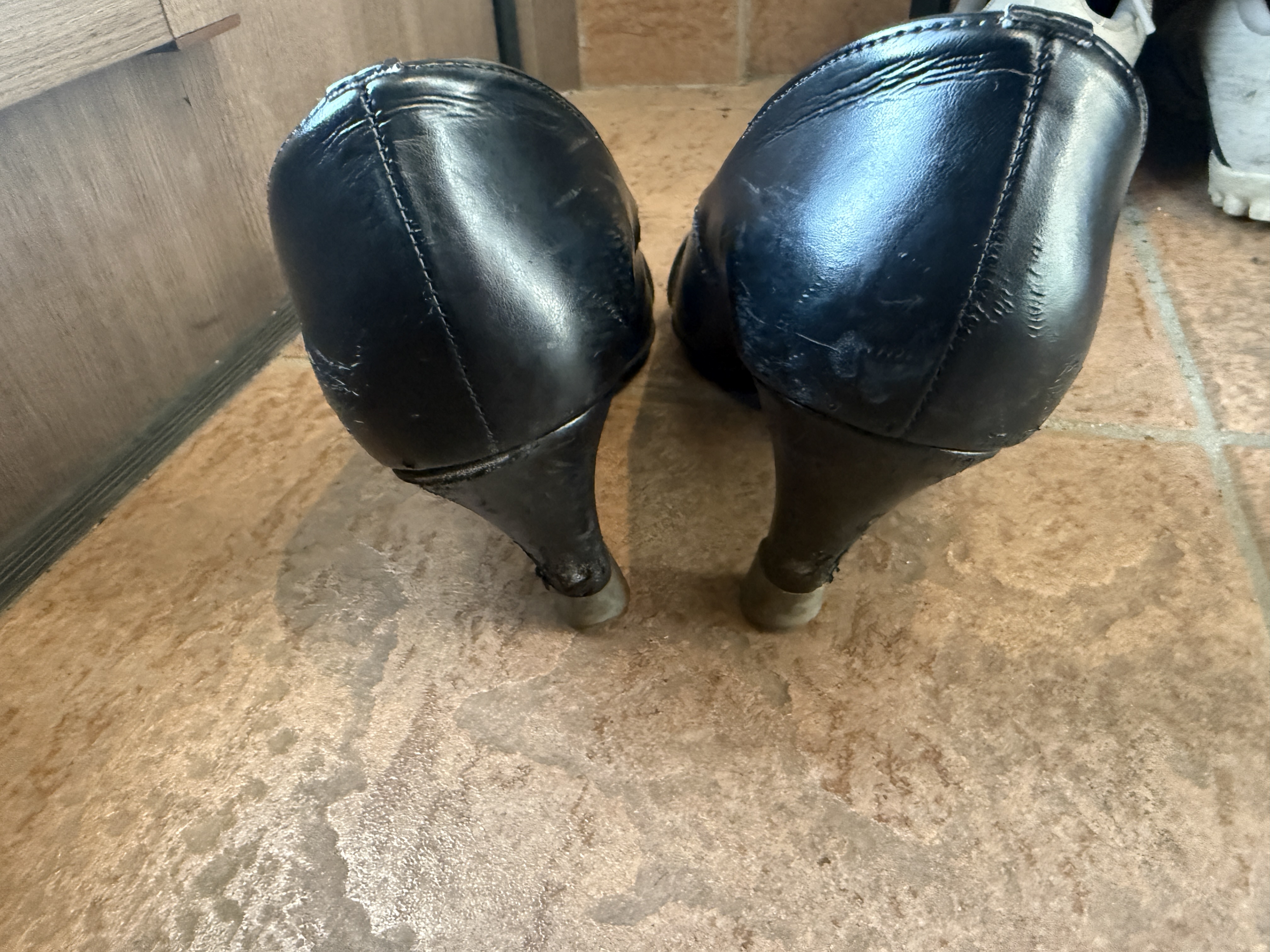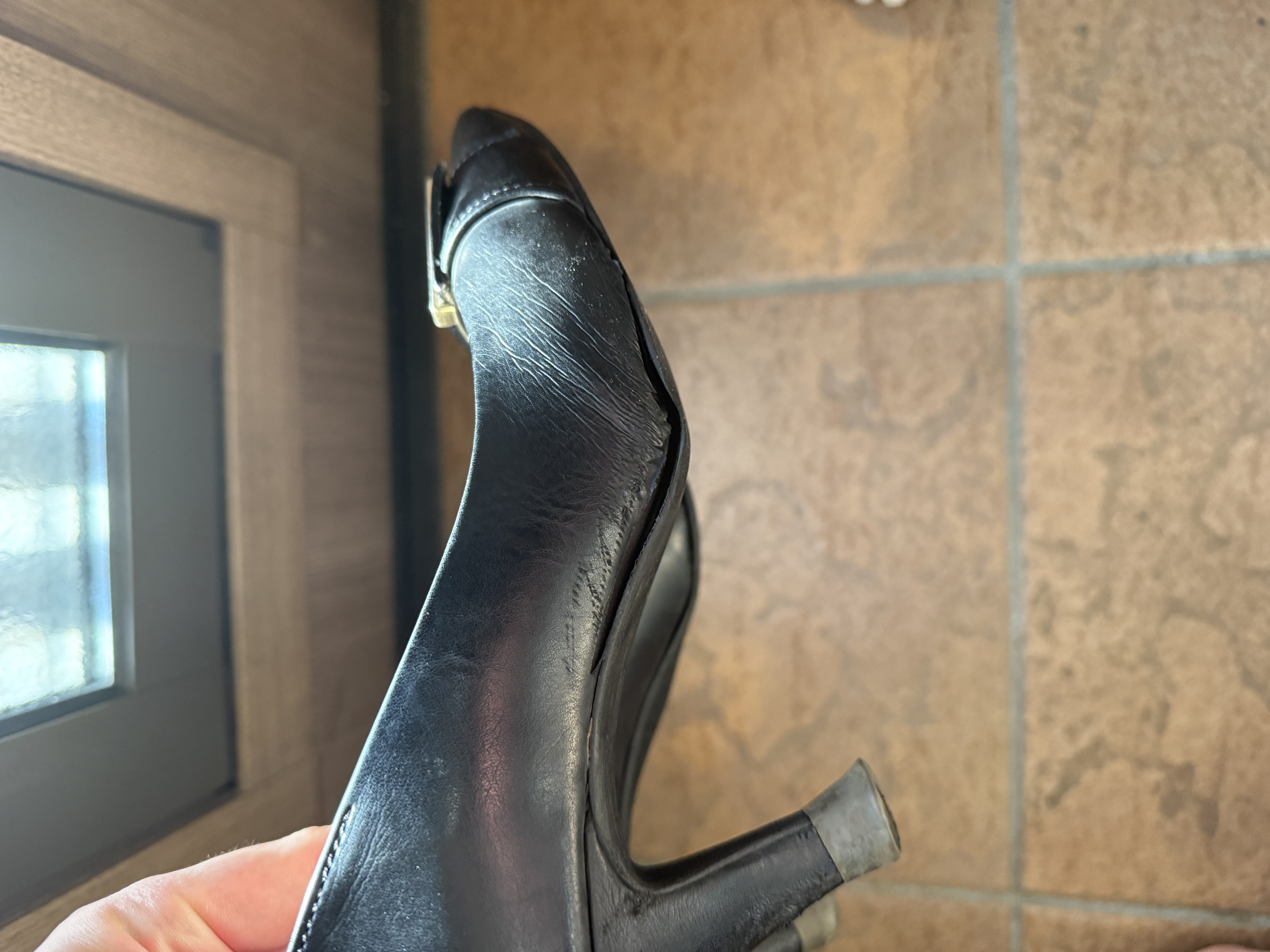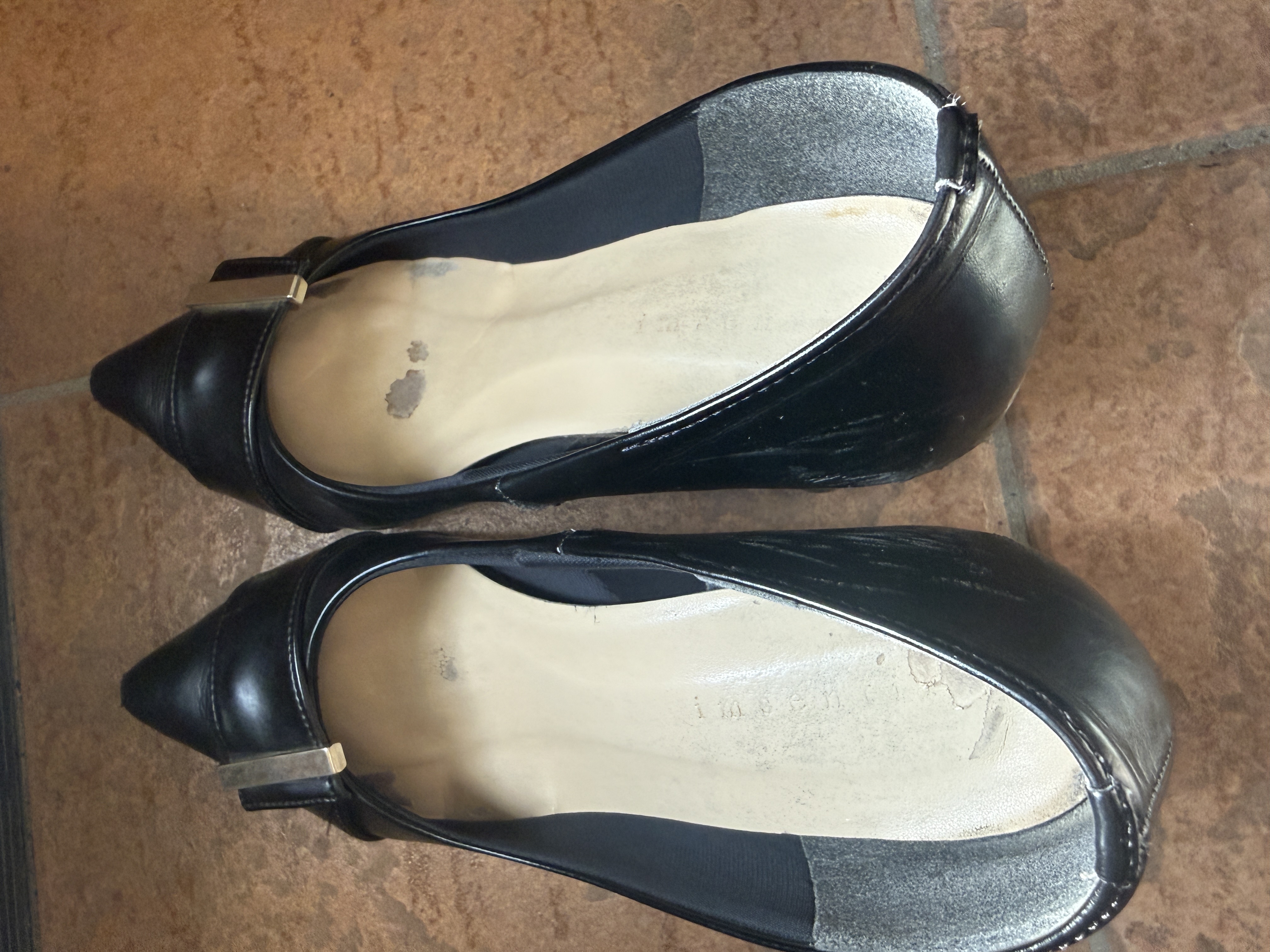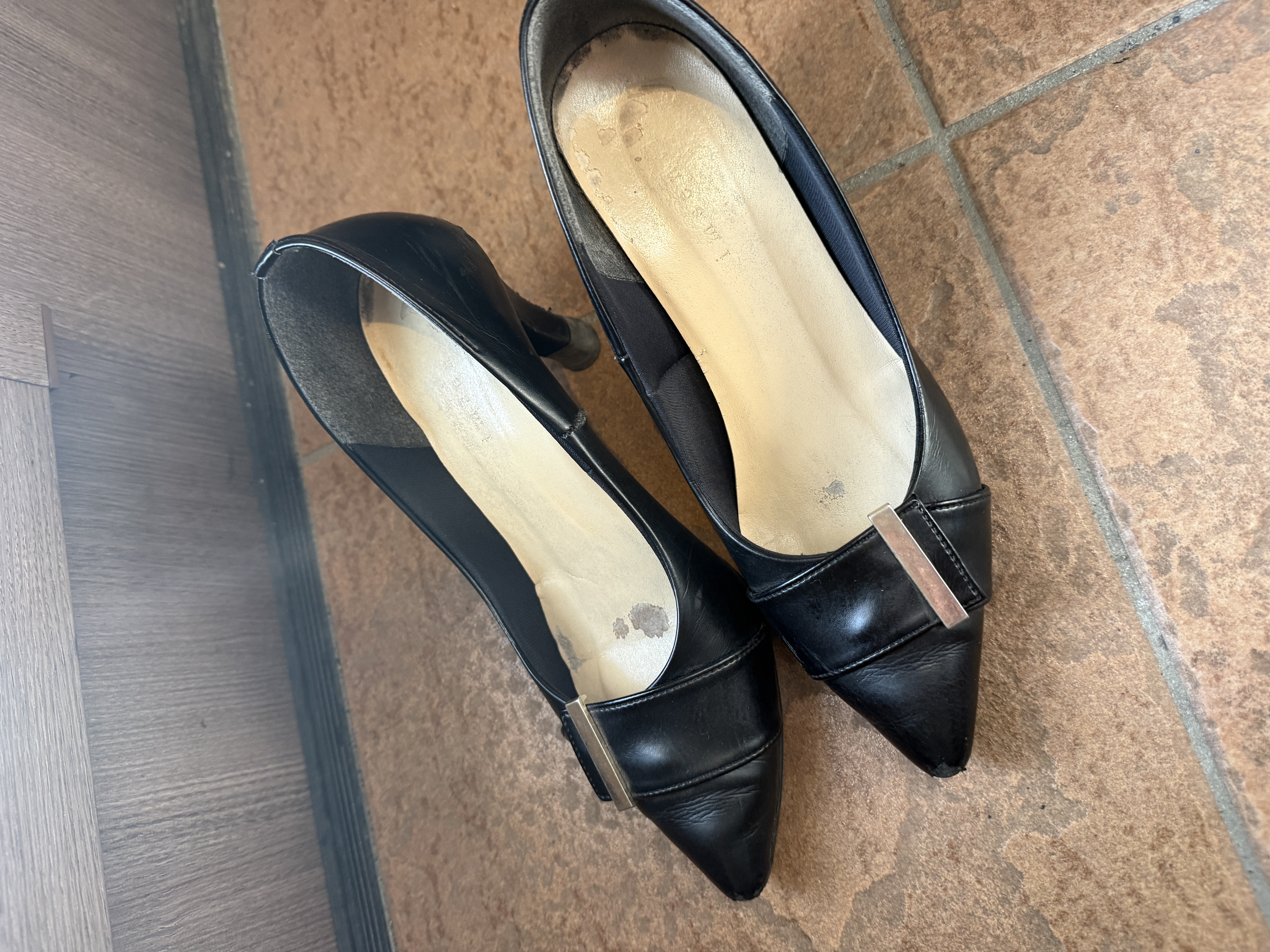 パンプスは鼻を近づけなくてもわかるほどの汗で蒸れた酸っぱい激臭がしました。中敷もボロボロでこの靴でずっと営業をしているのでしょう。本人やパンストの写真が撮れなくて残念でしたが、靴だけなんとか撮れました。