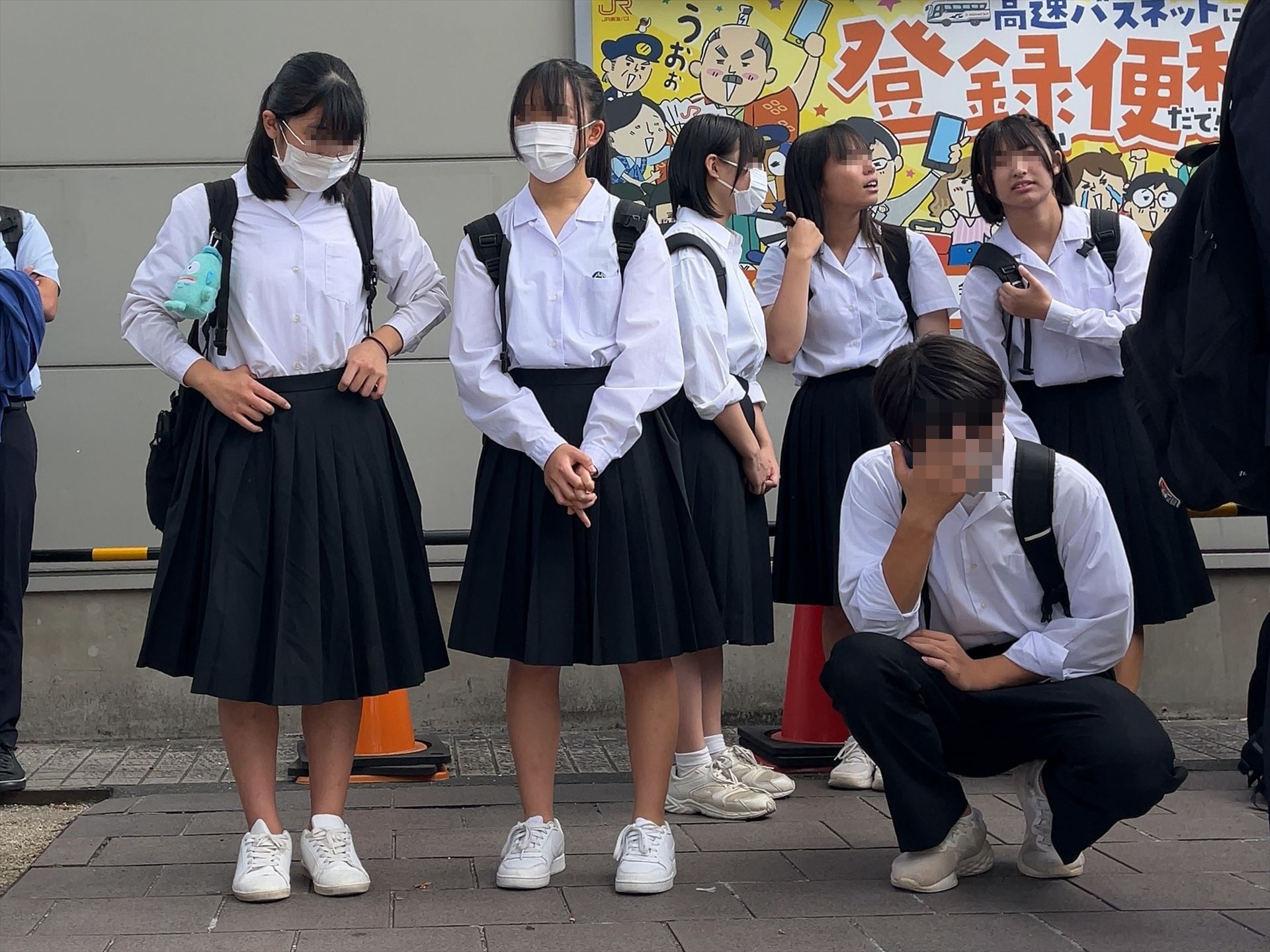 2段目の3枚目の子と3段目の2枚目の子のきちんと揃えた両脚を後ろから見たくて仕方ないほどエロい!